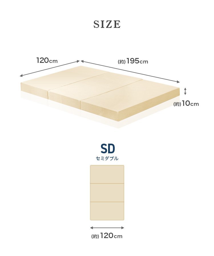 ウレタンの密度が高く耐久性に優れ、長時間使用してもヘタリにくい! 当店のマットレスは適度な反発力と体圧分散性により、理想的な寝姿勢を維持します。 適度な反発力は寝返りが打ちやすく快眠へと導き、スッキリした目覚めを迎えられます♪ 床敷きでも使える厚みたっぷり約10cm! さらに!肌触り抜群な「パイル生地」を使用し、1年中快適です。 三つ折り式なのでサッとたためて収納しやすく、立て置きで湿気対策にも最適! また、カバーは簡単脱着可能なU字ファスナー仕様&洗えていつでも清潔に使えます。 【商品仕様】 カラー:グレー サイズ(約):幅120cm×長さ195cm×厚み10cm(セミダブルサイズ) 折り畳み時(約):幅97cm×長さ65cm×厚み30cm 素材:高反発ウレタン 、パイル生地 他 硬さ:210ニュートン ※耐熱仕様ではございませんので、電気毛布との併用はおやめください。 (ウレタンマットレス 高反発マット マット ベットマット マットレストッパー 3つ折り 洗える カバー 体圧分散 シングル ダブル ベッド 敷き布団 寝具 210N 人気 おすすめ WEIMALL) ■ ブラウンはこちら ■ ベージュはこちら |