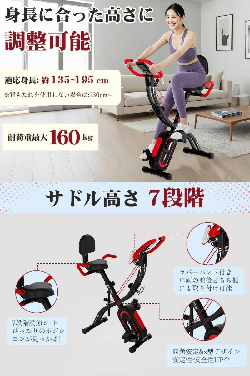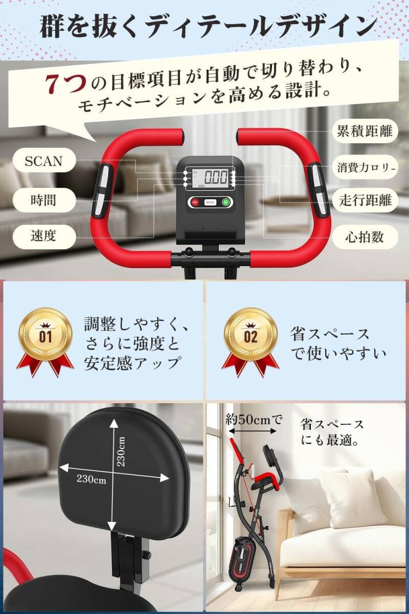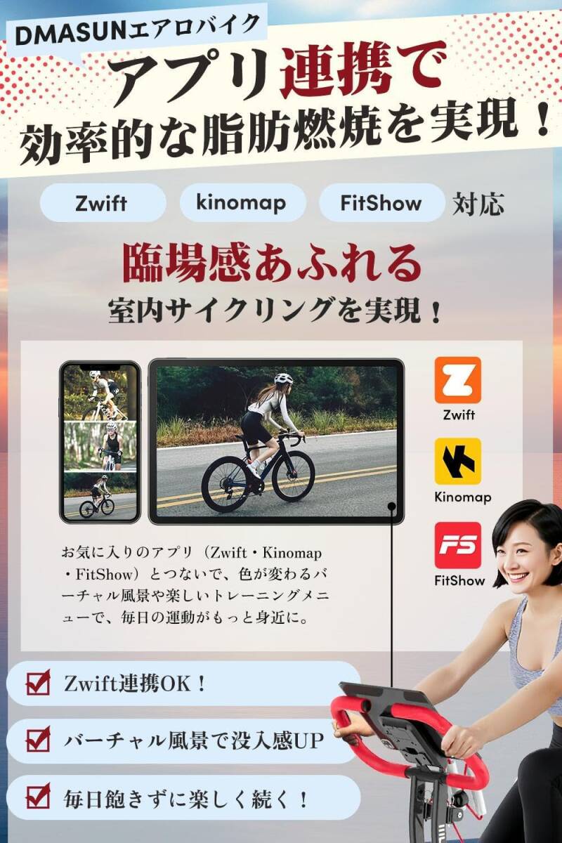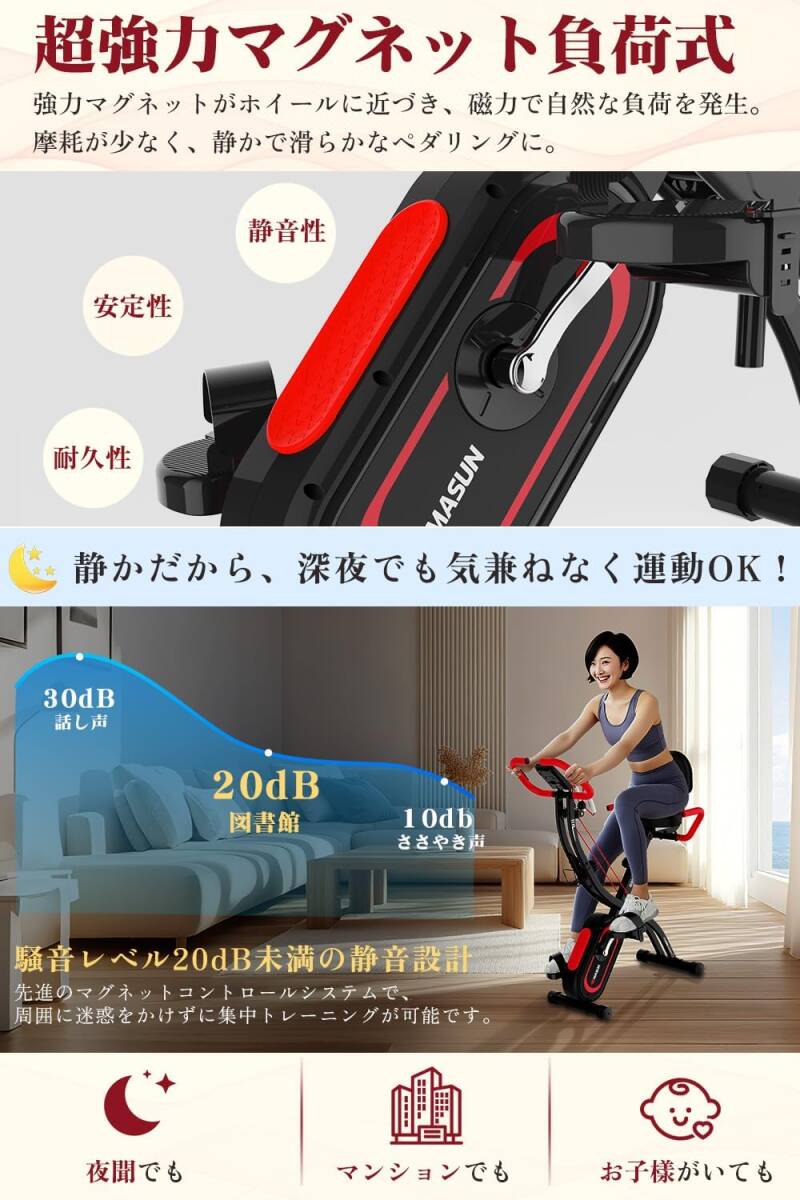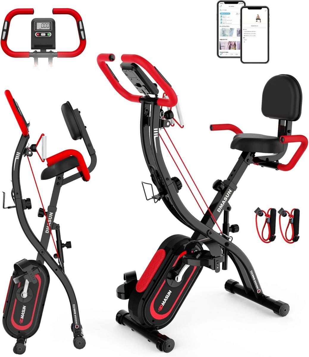 レッド色 【静音&折りたたみ式】 DMASUNエアロバイク フィットネスバイク トレーニングバイク 3-in-1アプリ連動/心拍数計測