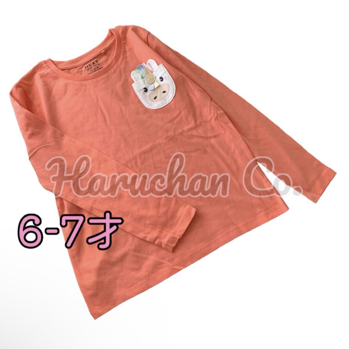 うるうるのおめめが可愛いユニコーンの胸ポケットワッペンがついたコーラルオレンジのロンT♪
