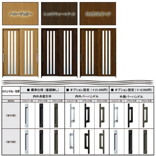 | ■ ハンドル仕様 | ■内外舟底引手 室外側:引手/室内側:引手 (基本仕様) 追加差額無し ------------------------------------------------------------------------- ■外側バーハンドル 室外側:バーハンドル/室内側:引手 (+12,000円) ■内外バーハンドル … 室外側:バーハンドル/室内側:バーハンドル (+21,000円) |