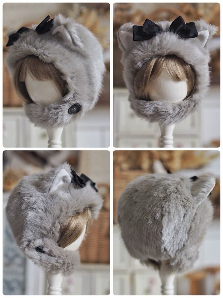 灰色猫の帽子です。リボンにはワイヤーが入っていますのでお好きな形に整えてアレンジしてください。