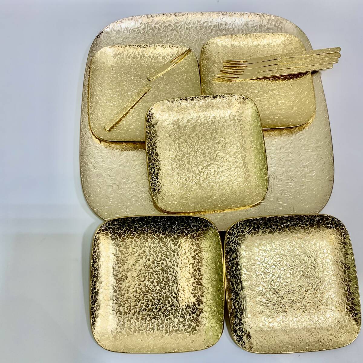 | #7119A 金メッキ大皿小皿フォークセット(1本破損) 大皿(26.4cm)1枚 小皿5枚(12.3m) フォーク5本 大皿の裏に社名有 詳細不明 現状保管品 | ||