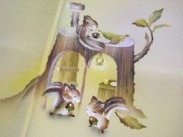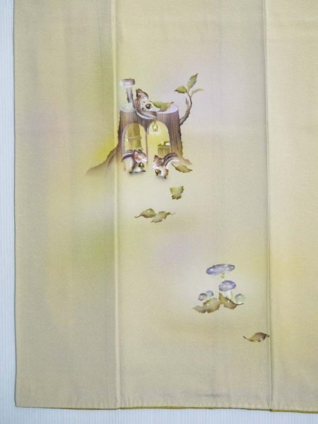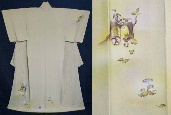 【KIRUKIRU】未着用・美品 現代呉服 付下げ 着物 身丈175cm 正絹 ベージュ たのしい森の暮らし リス きのこ 葡萄 和装 着付け