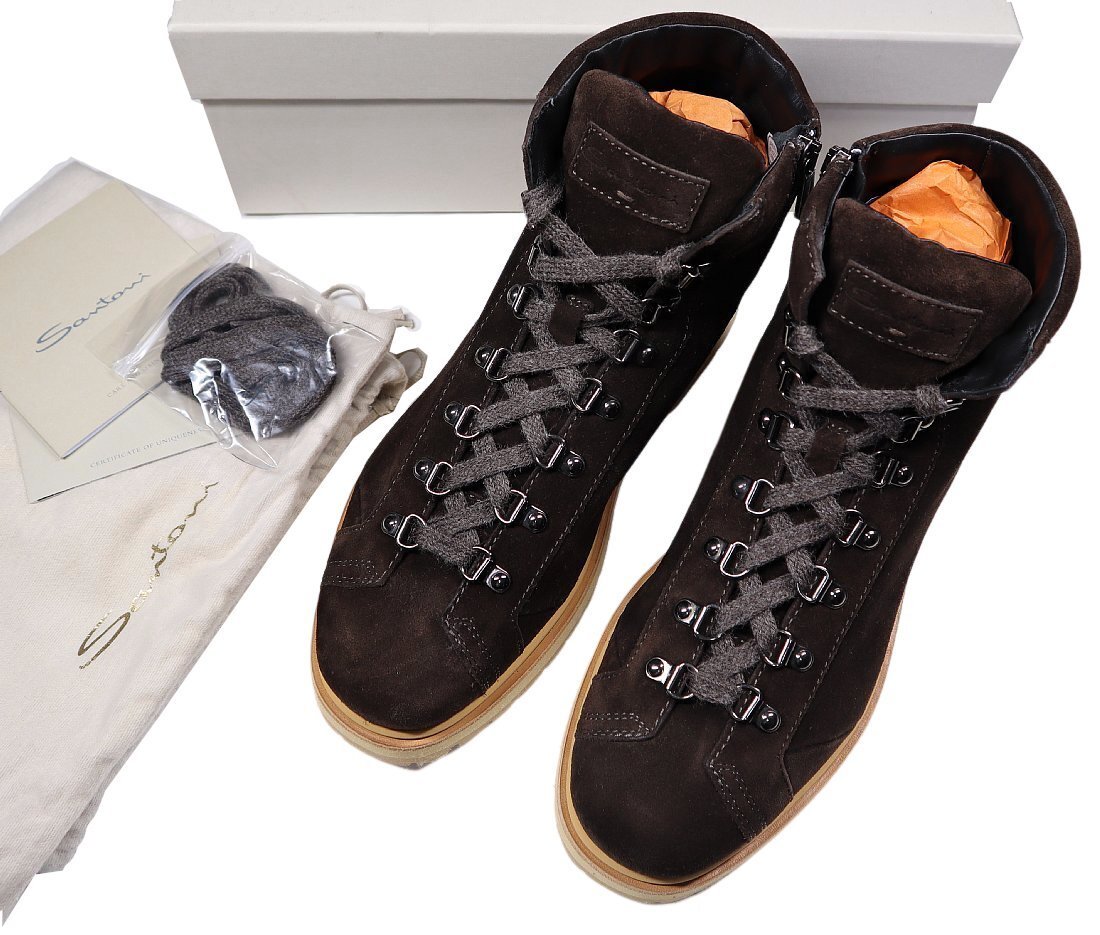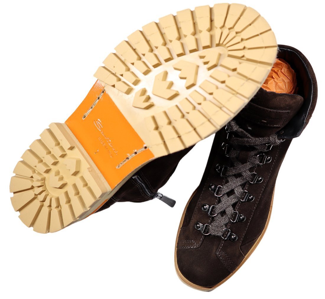 自身も靴職人である現会長「アンドレア・サントーニ」氏が、イタリアでも靴の生産地として名高いマルケ州に1977年に創業した人気のラグジュアリーシューズブランド。”時代にあった優雅で洗練されたデザイン” と ”芸術的なカラー” は多くの洒落者を魅了しています。しかも、今尚すべての工程を熟練した職人の完全手作業によって生産する数少ないメーカーです。そのため、高い品質を誇っています。また、「サントーニ」のお家芸、ハンドペイントの技術には目を見張るものがあります。これは ”アンティカータ・ア・マーノ” と呼ばれる手間のかかるテクニックなのですが、まったく色がついていないヌメ革の状態から、指で色を載せていくもの。靴によっては最大15回も色を塗り重ね、1足に4時間を要するものもあるほど。手間暇を惜しまず、熟練した職人が時間を掛けたからこそできる「芸術的カラー」であり、履き込むほどに味わいをましてきます。あのラグジュアリーブランドの雄「Hermes(エルメス)」のレザースニーカーを生産していたことでも有名で、ここのレザースニーカーも人気があります。本格レザーシューズブランドが手掛けるラグジュアリーなレザースニーカーとして、セレブがこぞって愛用し、世界のファッショニスタから絶大な支持を受けているほど。7歳から靴作りを始めた、2代目「ジュゼッペ・サントーニ」氏が21歳の若さでCEOになってからというもの、家族とともに拡大させ、街の小さな靴メーカーから、約500人の職人体制で世界70カ国以上に展開させる一大靴ブランドにまで躍進させました。ドイツの最高級自動車メーカー「メルセデスAMG」やスイスの最高級時計メーカー「IWCシャフハウゼン」と毎シーズンコラボレーションしたり、ラグジュアリーなバッグコレクションを展開したりと、現在は ”イタリアトップのラグジュアリーシューズブランド” にまで成長しています。日本でも銀座の直営店をはじめ、ストラスブルゴ、伊勢丹メンズ、阪急メンズ、三越、タカシマヤ、大丸など多くのセレクトショップや有名百貨店などにて扱われております。