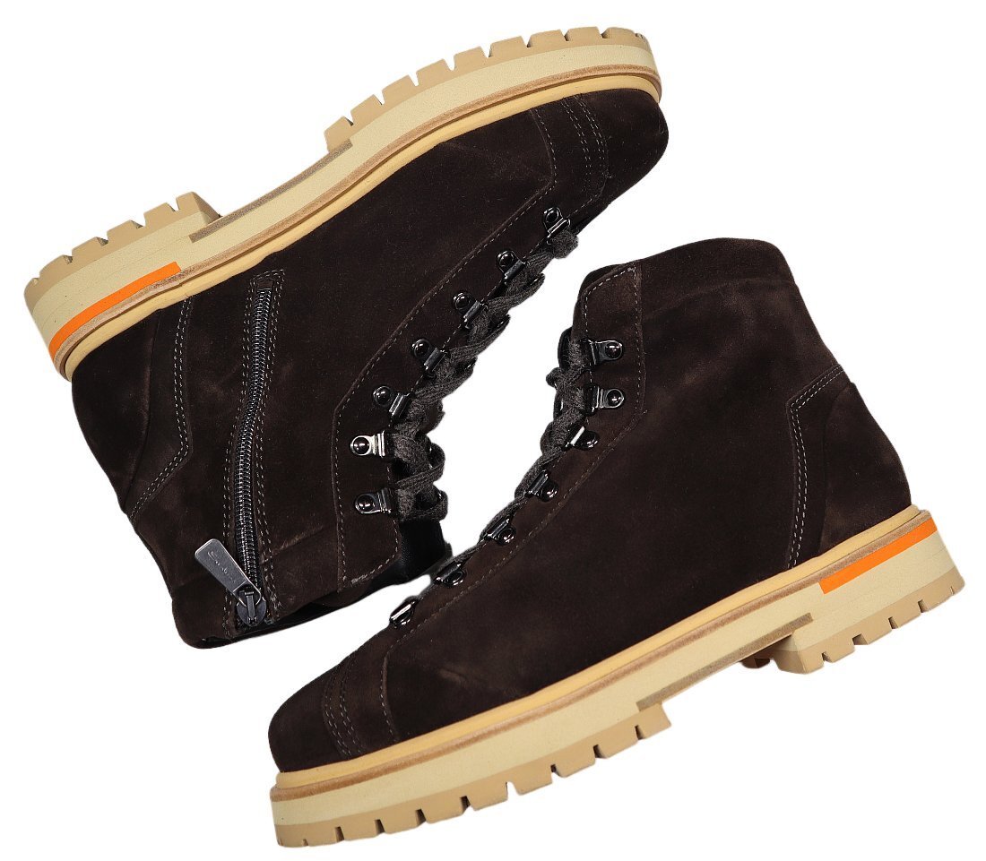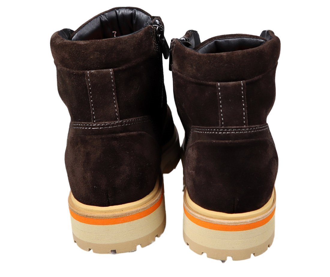 上質カーフスエード素材ならではのやわらかく、滑らかな質感が魅力のダークブラウン色。起毛感のある太紐、オレンジカラーのサイドソール、厚底のダイナマイトソールも洒脱なアクセントになっています!