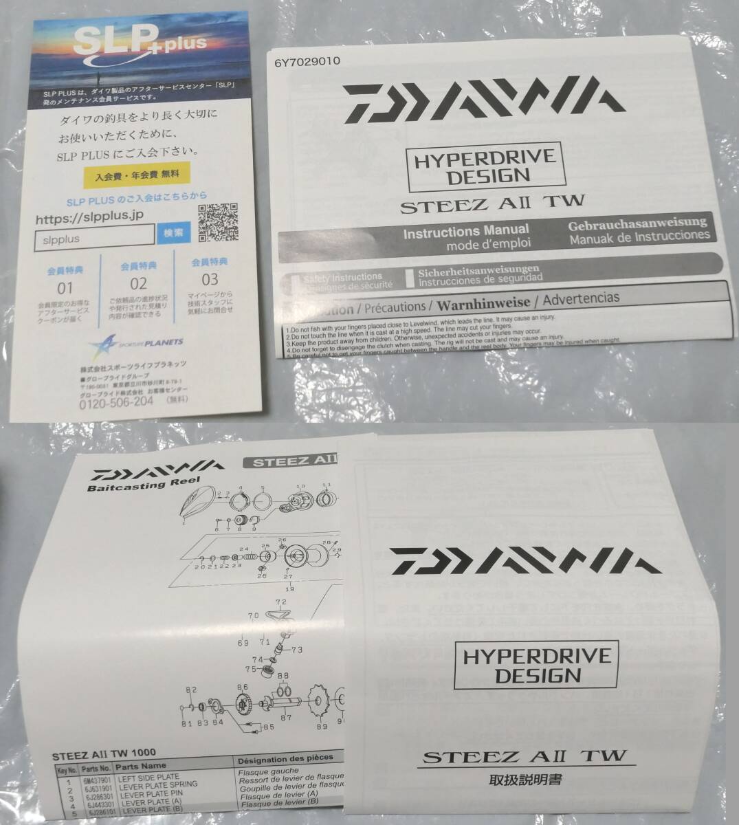 付属品は画像のとおり、すべて揃っていると思いますが、専用箱、保護用プラ袋、取扱説明書一式、分解図、リールカバー、SLP+登録用紙です。