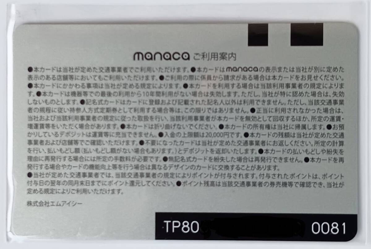 | 名古屋鉄道のICカード manaca。落札者様でチャージ(入金)の うえ使用可能。新規購入後は写真のようにOPP袋に入れて、タッチのみで 残高を0円にしています。傷はついていないと思われます。 全国の交通系ICカードの相互利用カードです。カード番号の下4桁が 0081です。 |