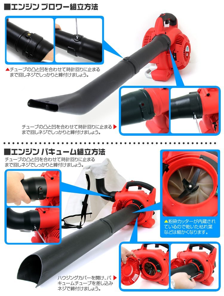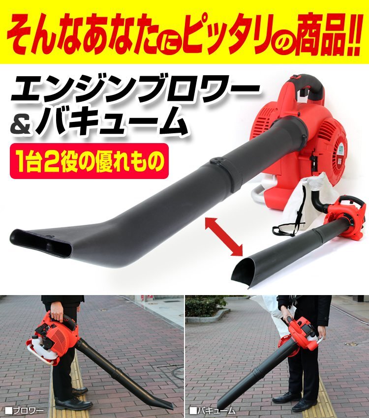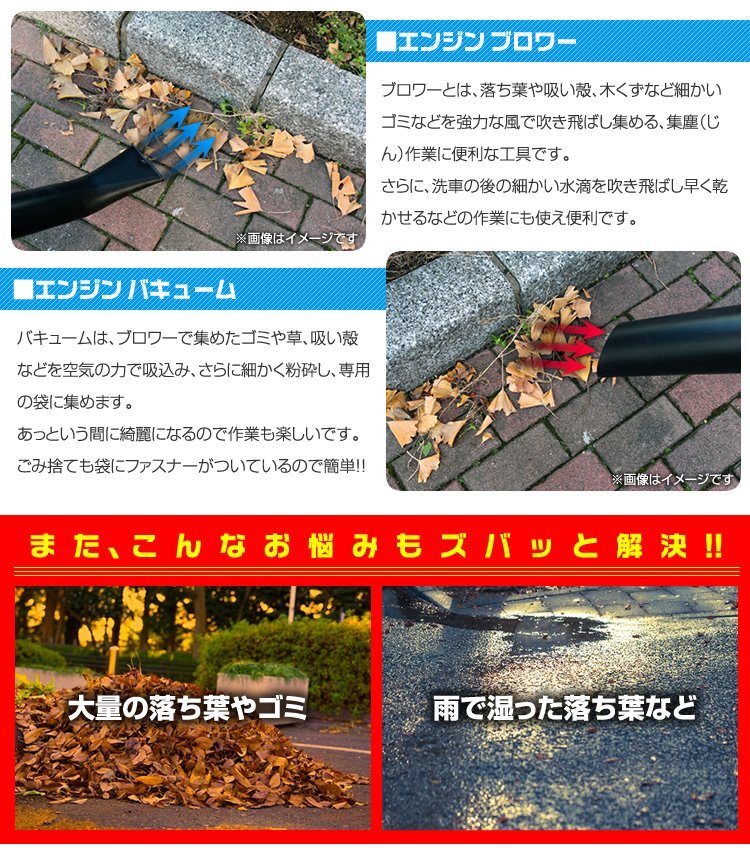 1台2役 エンジンブロワー &バキューム 落ち葉や刈り草などの吹き飛ばし&吸込みに エンジン式なので延長コード不要 |