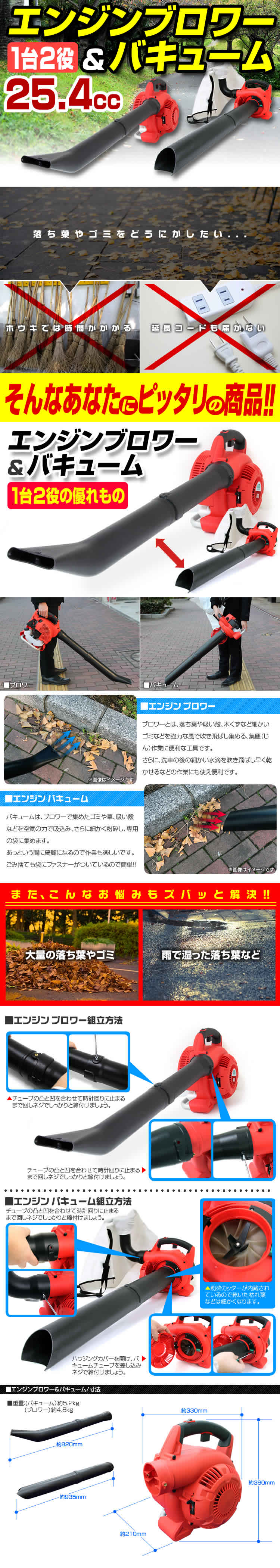 ★商品仕様 エンジン: 空冷2サイクルガソリンエンジン 排気量: 25.4cc 使用燃料:混合ガソリン(25:1) 重量(約): 4.8kg (ブロワー)/ 5.2kg (バキューム) 燃料タンク容量(約): 0.5L 風量:7.8cm2 風速:75m/秒 ダストバッグサイズ:35L 始動方式:リコイルスターター式 ★商品仕様 本体 ブロワノズル(A) ブロワノズル(B) バキュームノズル(A) バキュームノズル(B) ダストバック ボックスレンチ 混合ガソリン容器 固定ネジ ★注意事項 ※商品は、モニターによって色合いが異なって見える場合があります。 ※仕様・デザインは改良のため予告なく変更することがあります。 商品コード:A86A 【もちろん新品未使用品です】 ▼検索キーワード ブロワバキューム エンジン ブロワーバキューム エンジンブロワーバキューム 落ち葉掃除機 エンジンブロア ブロアー ブロワー バキューム 送風機 集じん機 集塵機 集草機 人気 おすすめ ピックアッププラザ PICKUP PLAZA |