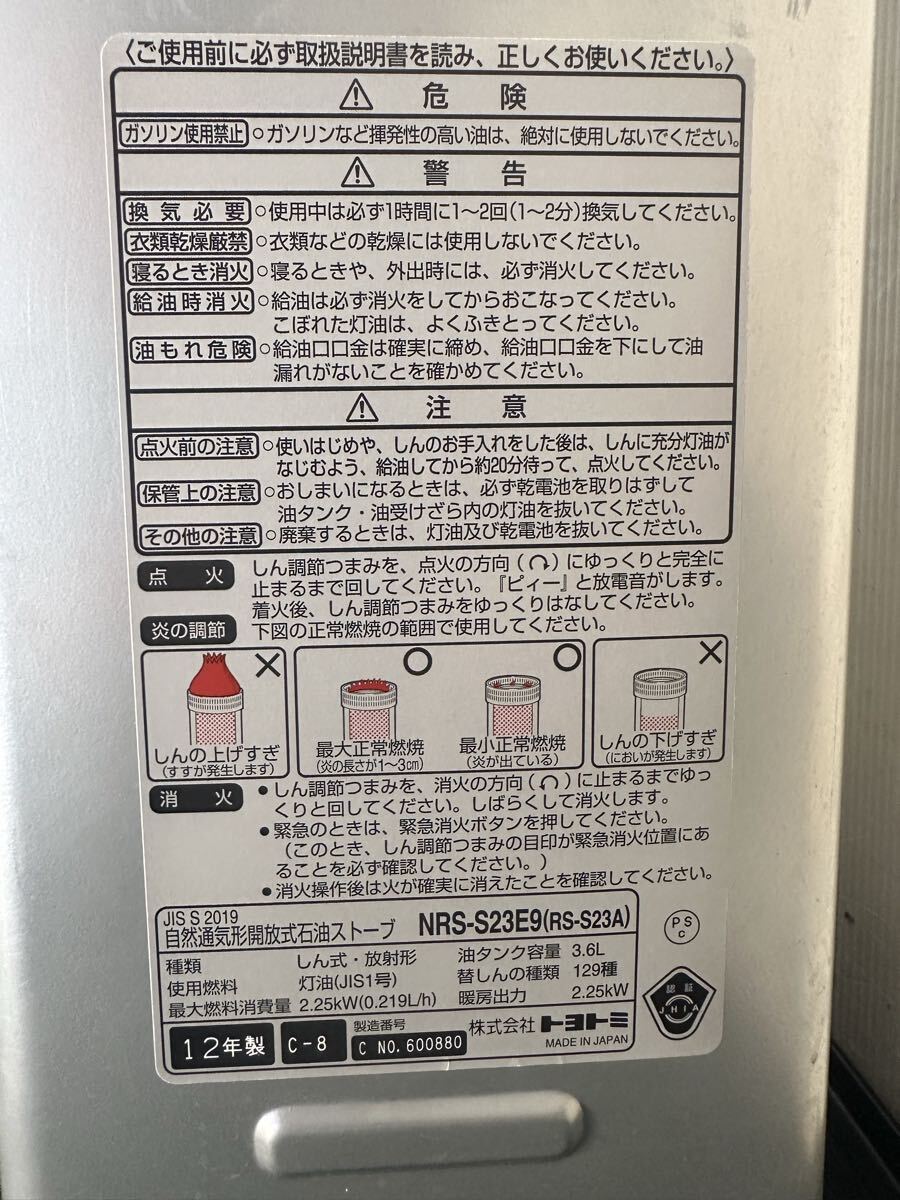 ★ トヨトミ 自然通気形開放式 石油 ストーブ NRS-S23E9 2012年製 チャッカマンにて点火確認★