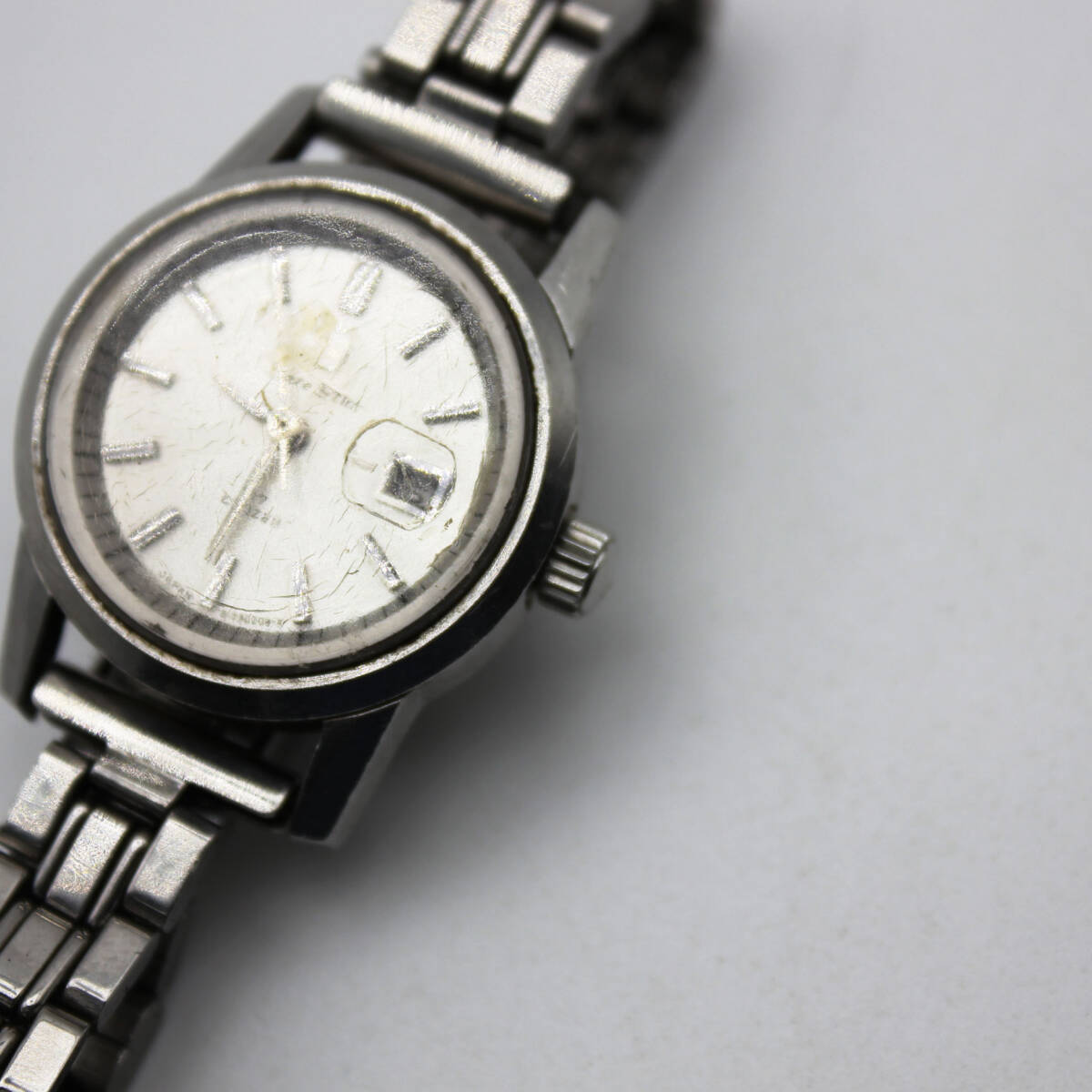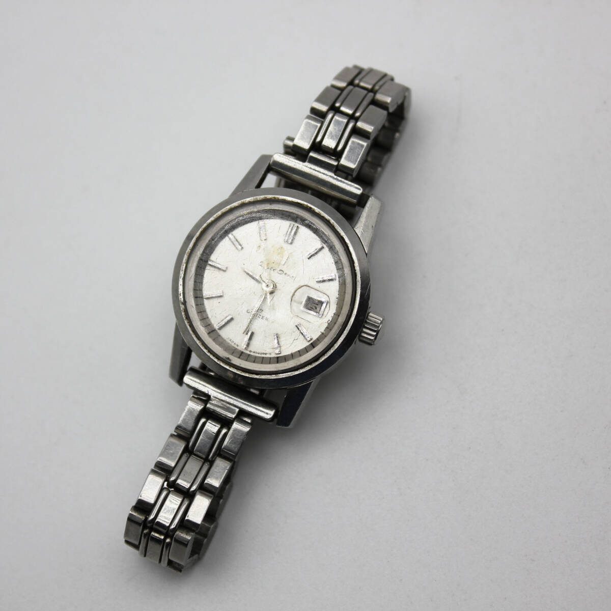 レディース腕時計 手巻き デイト 稼働品 文字盤シルバー ラウンド