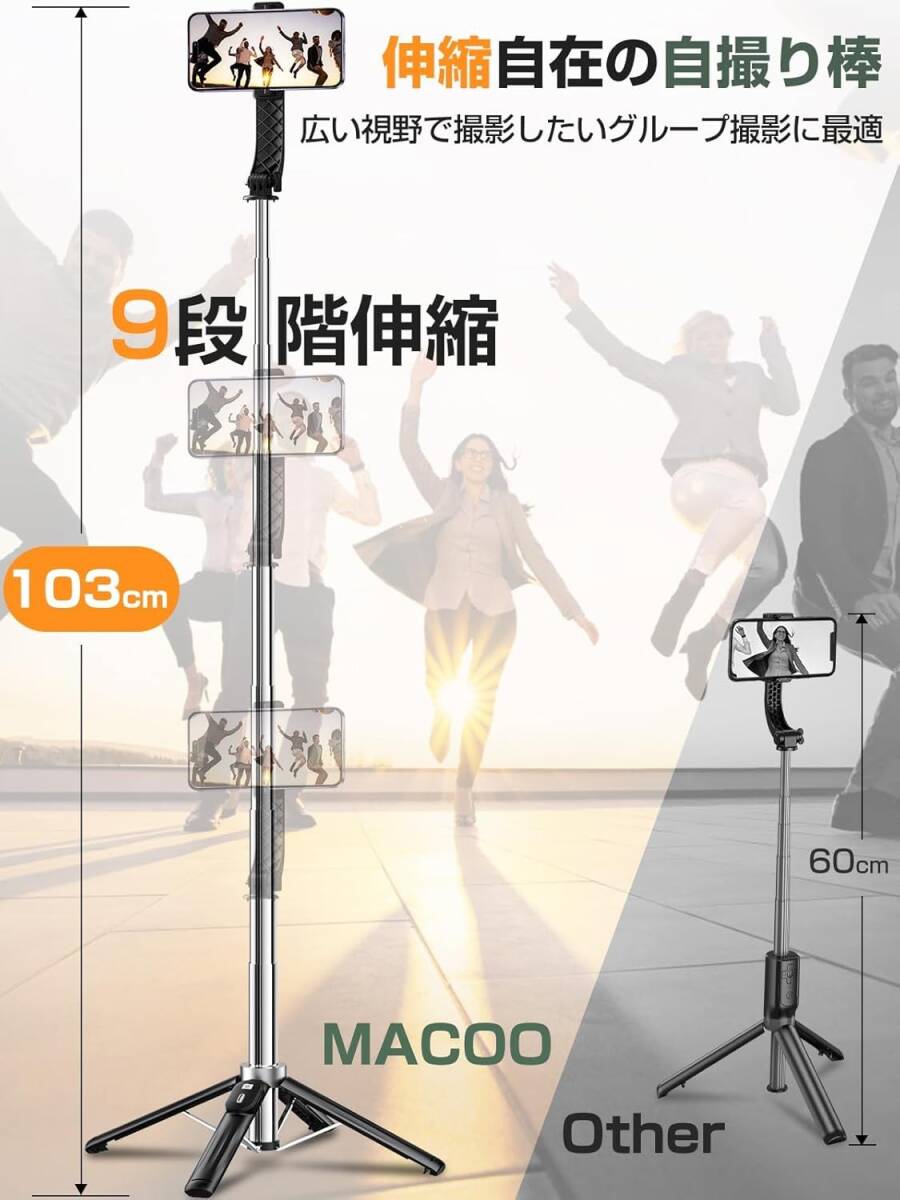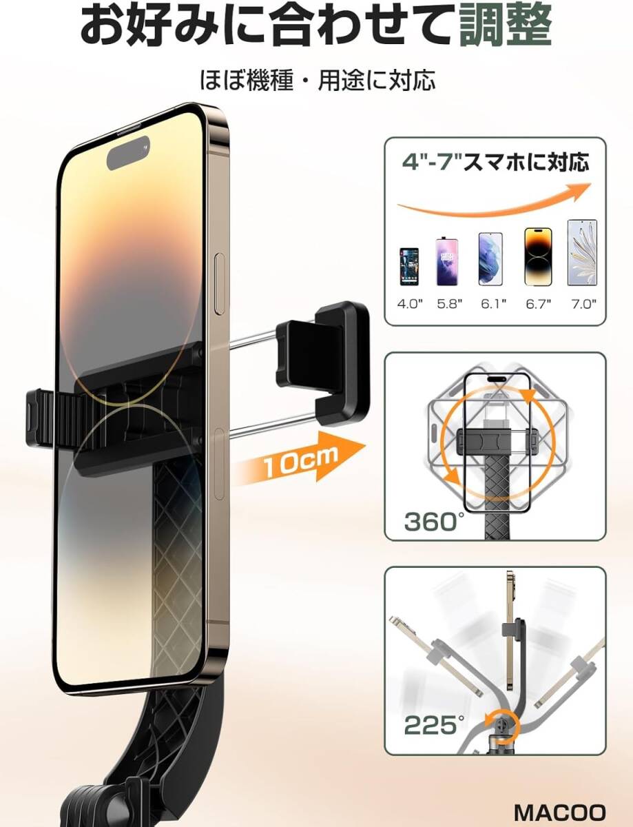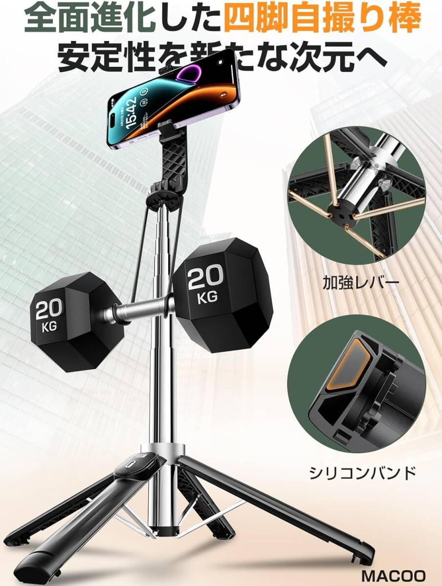 MACOOの新設計「四脚安定モデル」自撮り棒は、加強レバーと滑り止めシリコンバンドにより抜群の安定感を実現。耐荷重20kgで、iPhone Proやカメラにも対応。