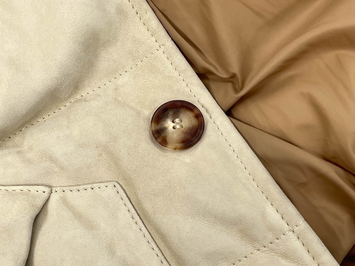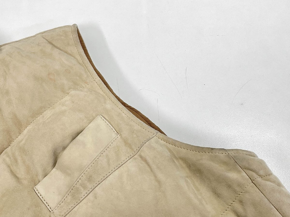 ・多少の着用感、多少のスレと所々に薄い汚れや小さなシミ汚れがございます。特に気になるのは前身頃や襟周りです。また、右裾付近に3個所小さくレザーの起毛が剥げている箇所がございます。それ以外の状態は良いですが、御理解の上ご購入ください。素材特有の細かいスレキズや色むら感などはご容赦ください。