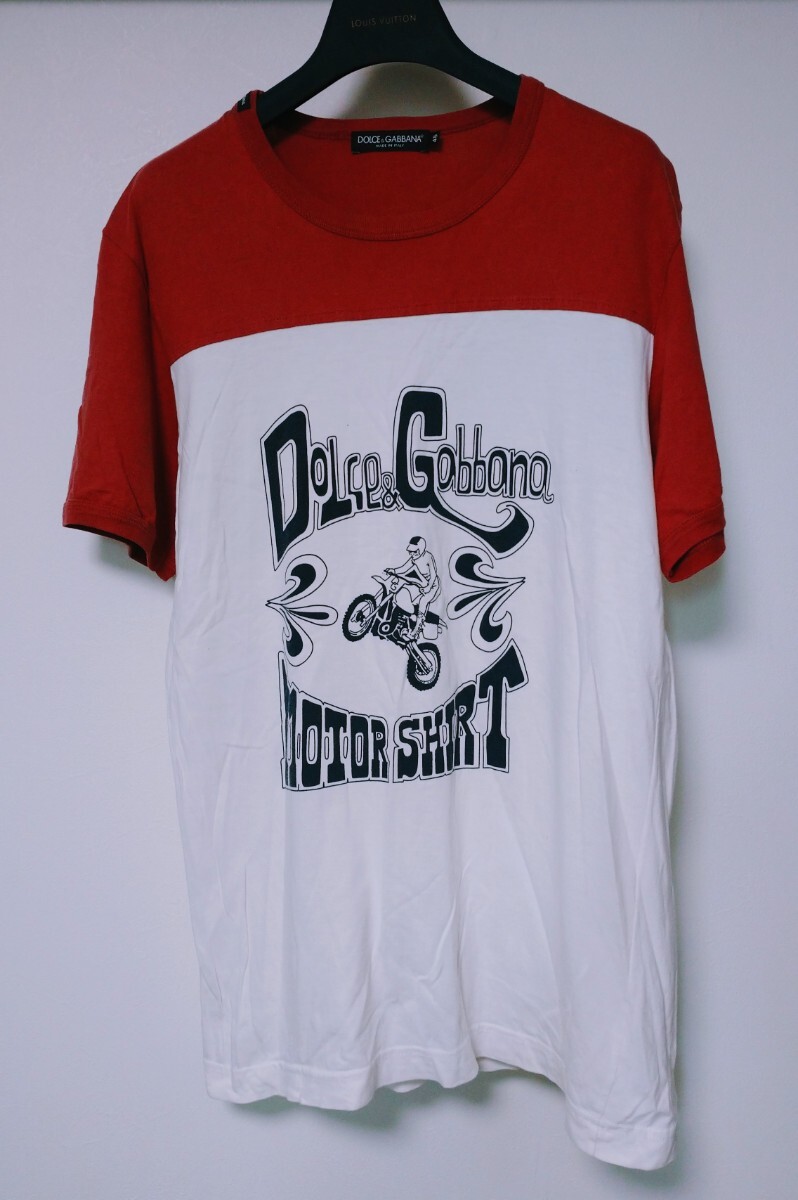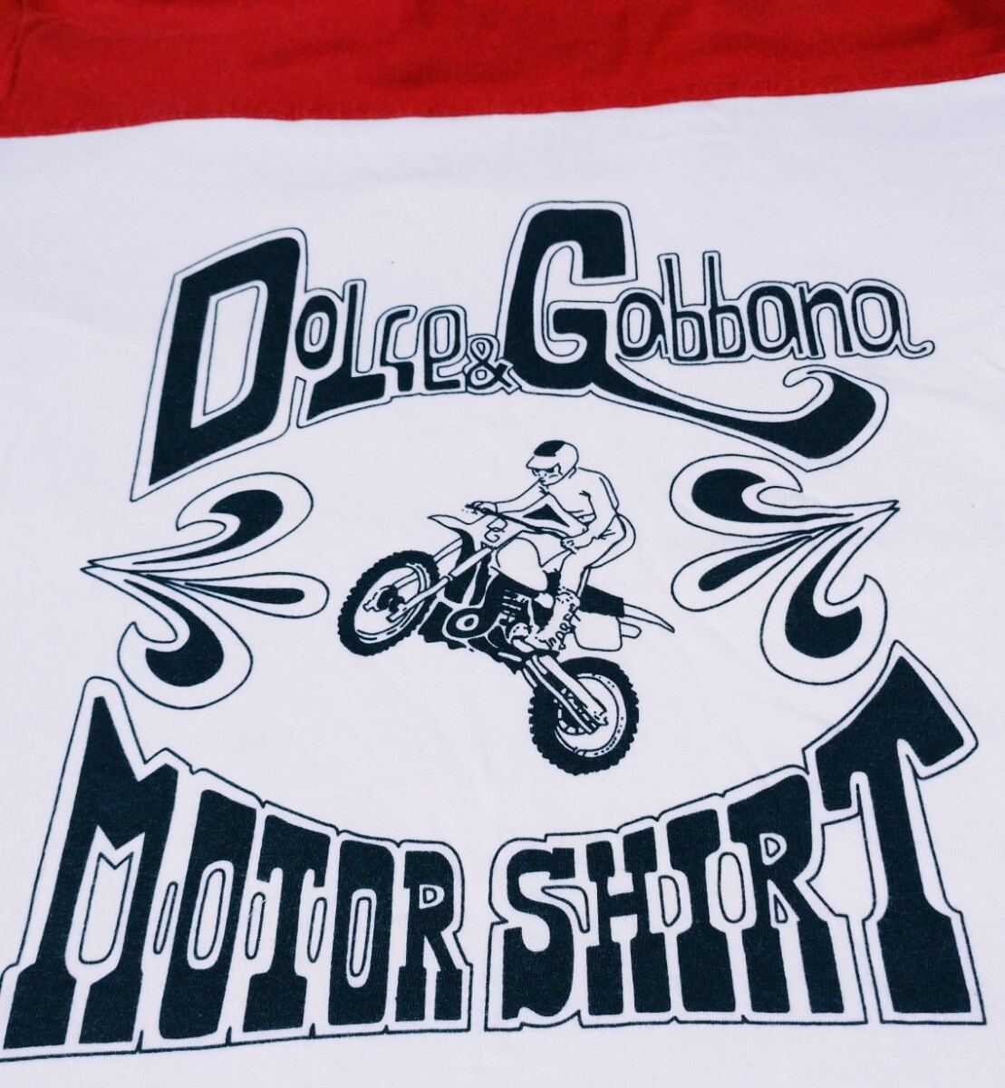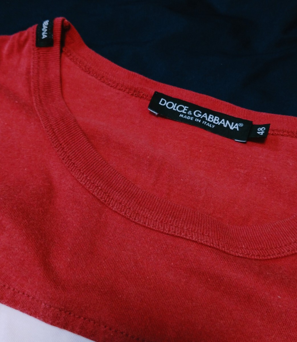 赤と白の生地に、ドルチェ&ガッバーナのロゴを含んだプリントが施されています。