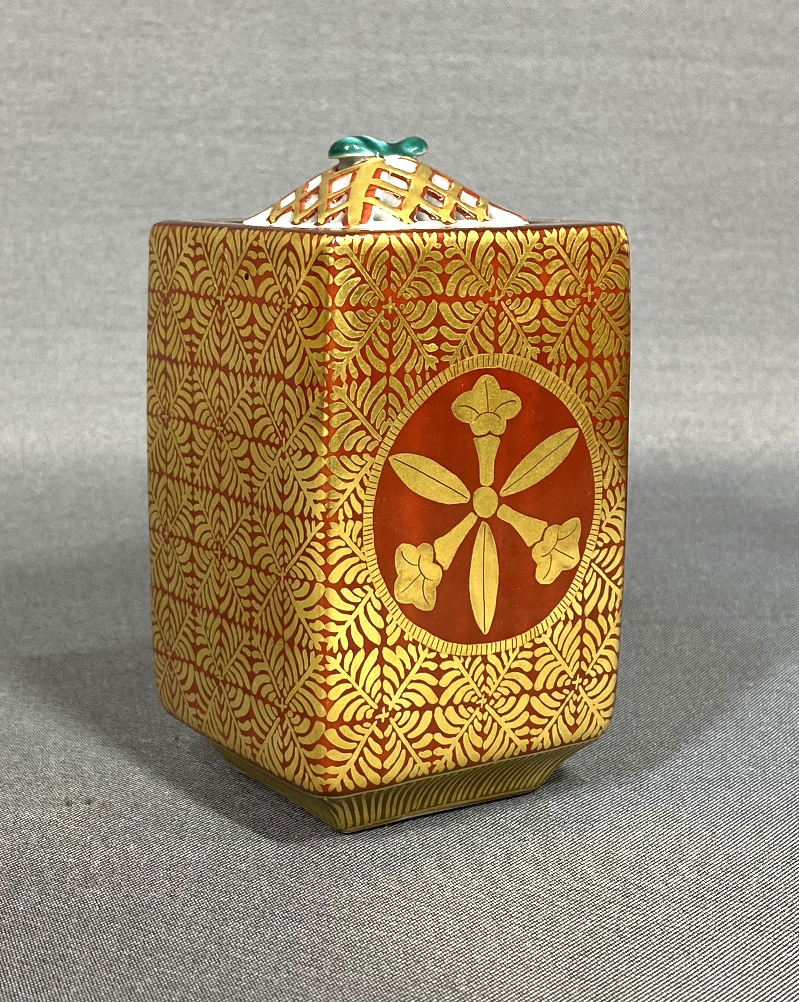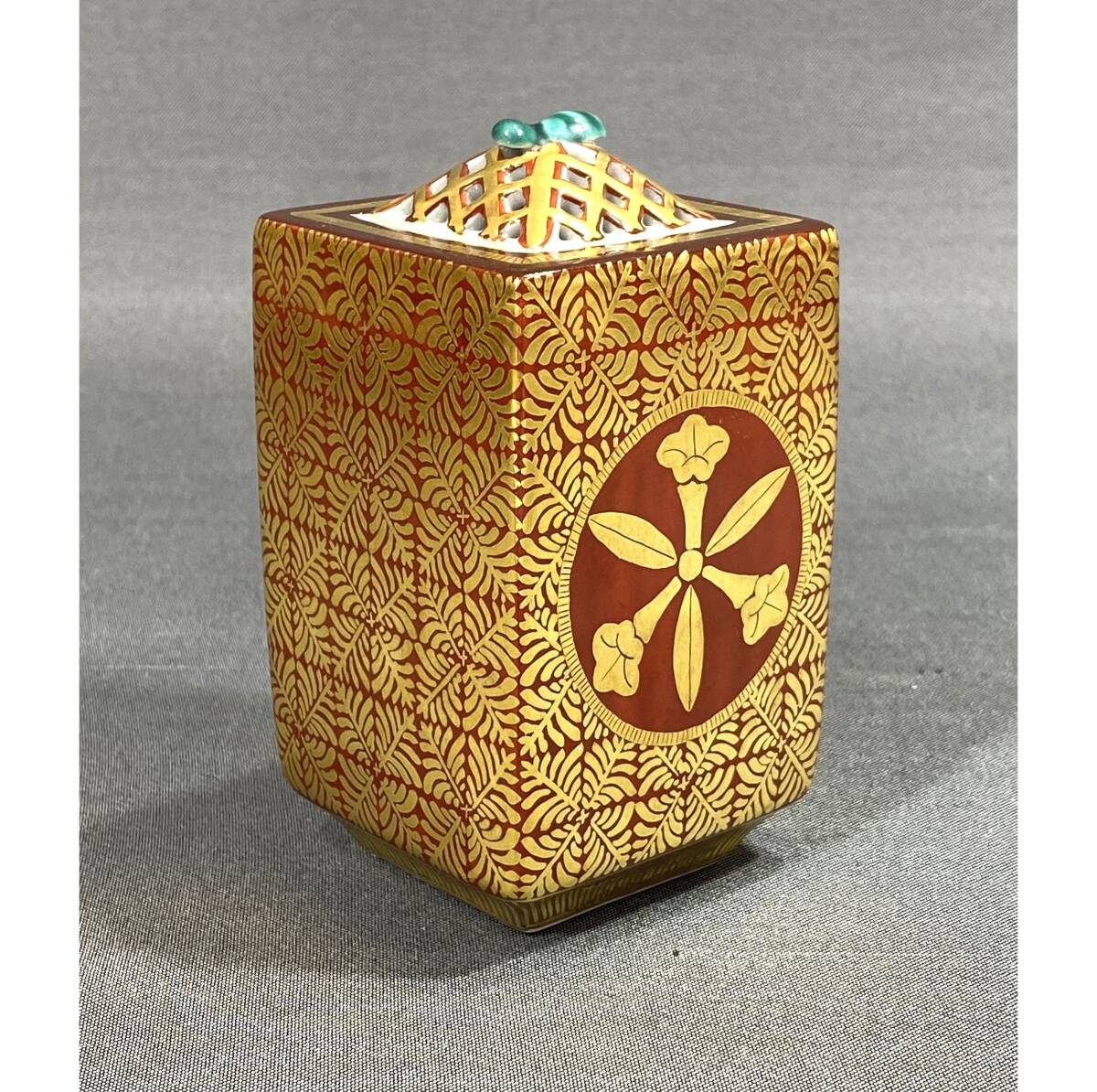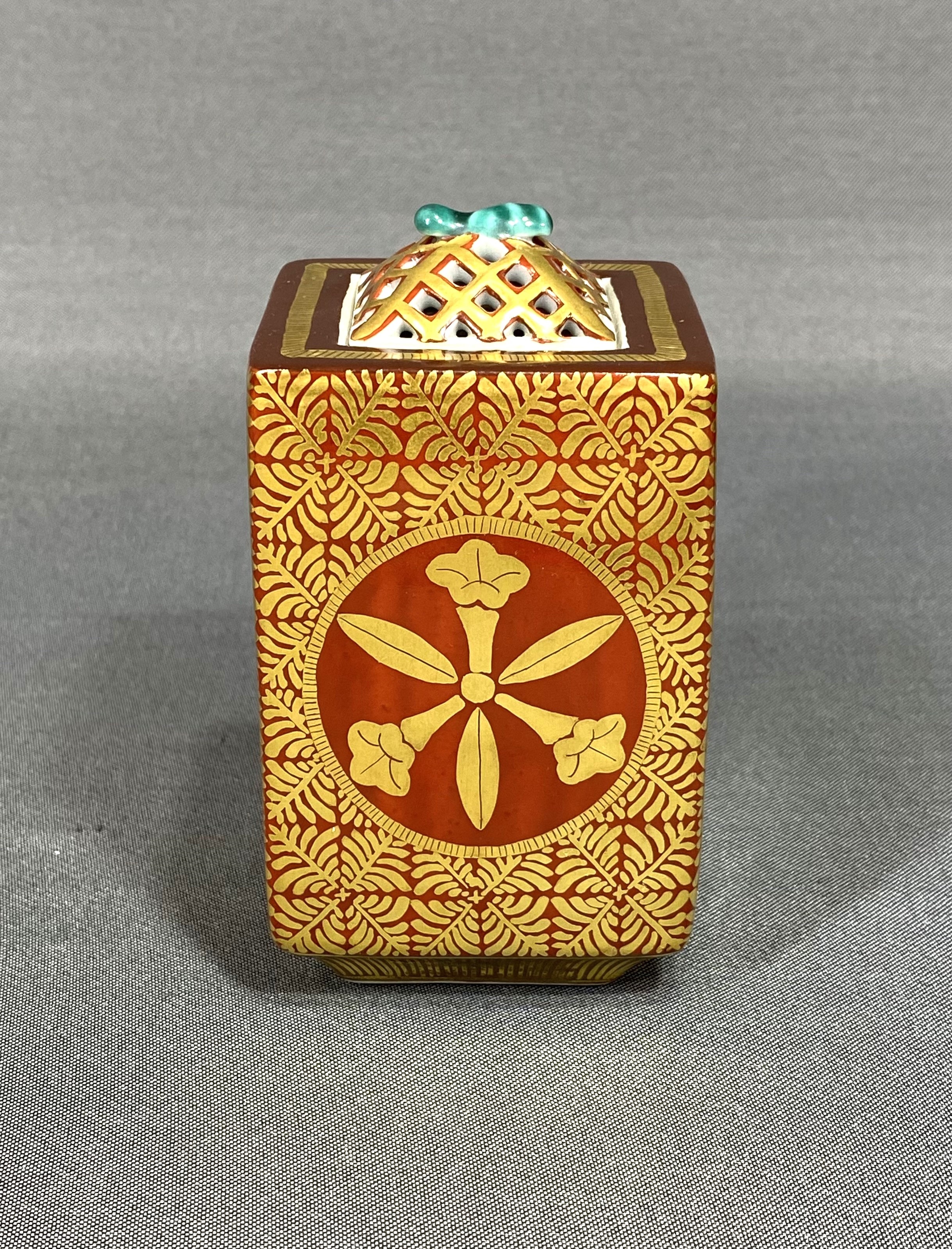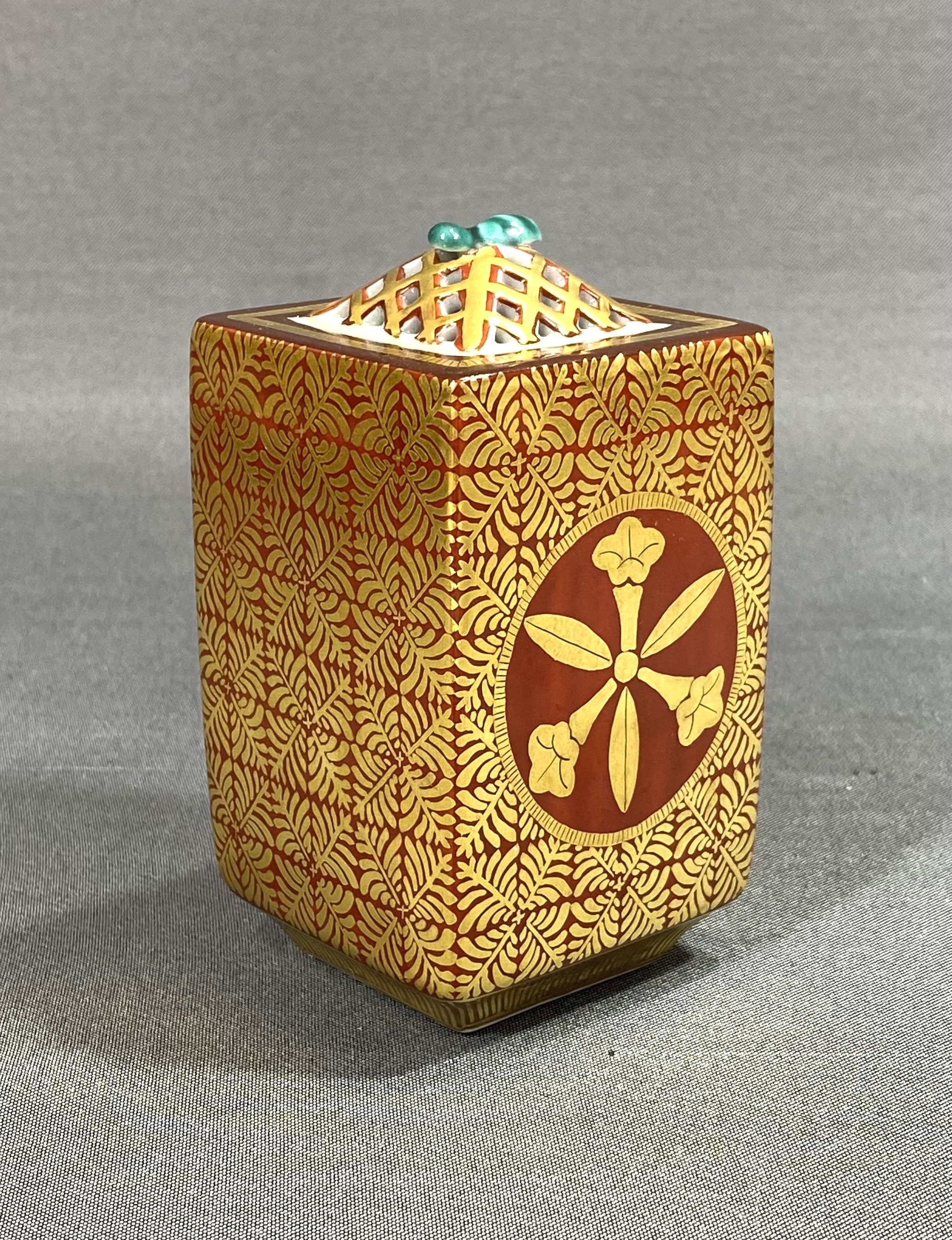 【風車】 人間国宝 九谷焼 中田一於(和雄) 赤絵 金彩 花葉文 透彫網形蓋 四角香炉▲金襴手▲色絵金彩