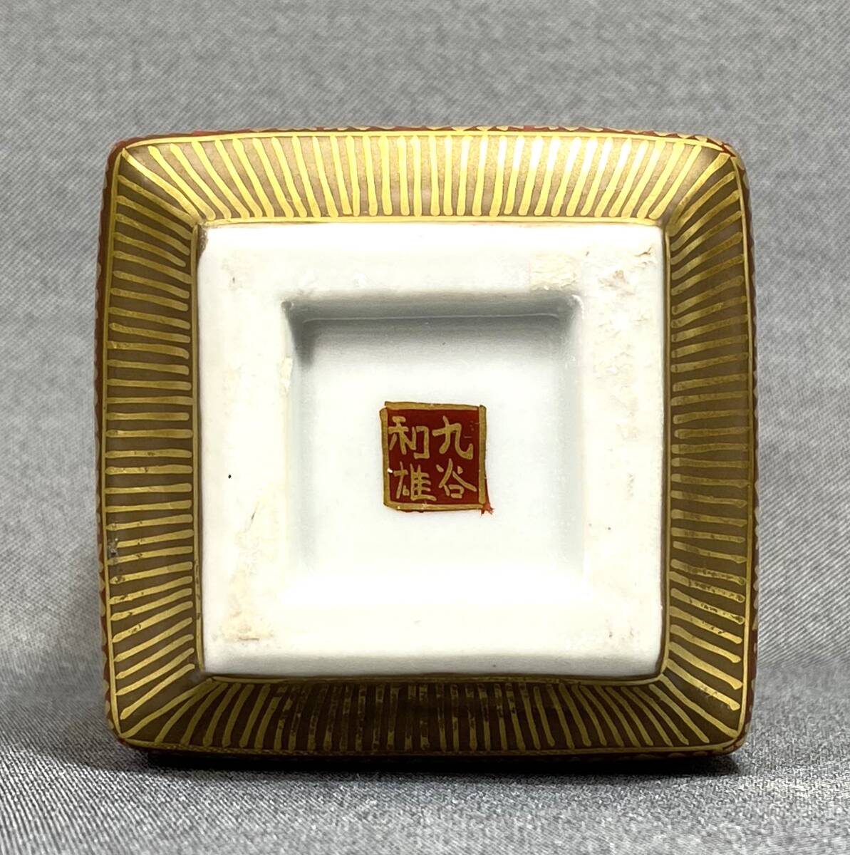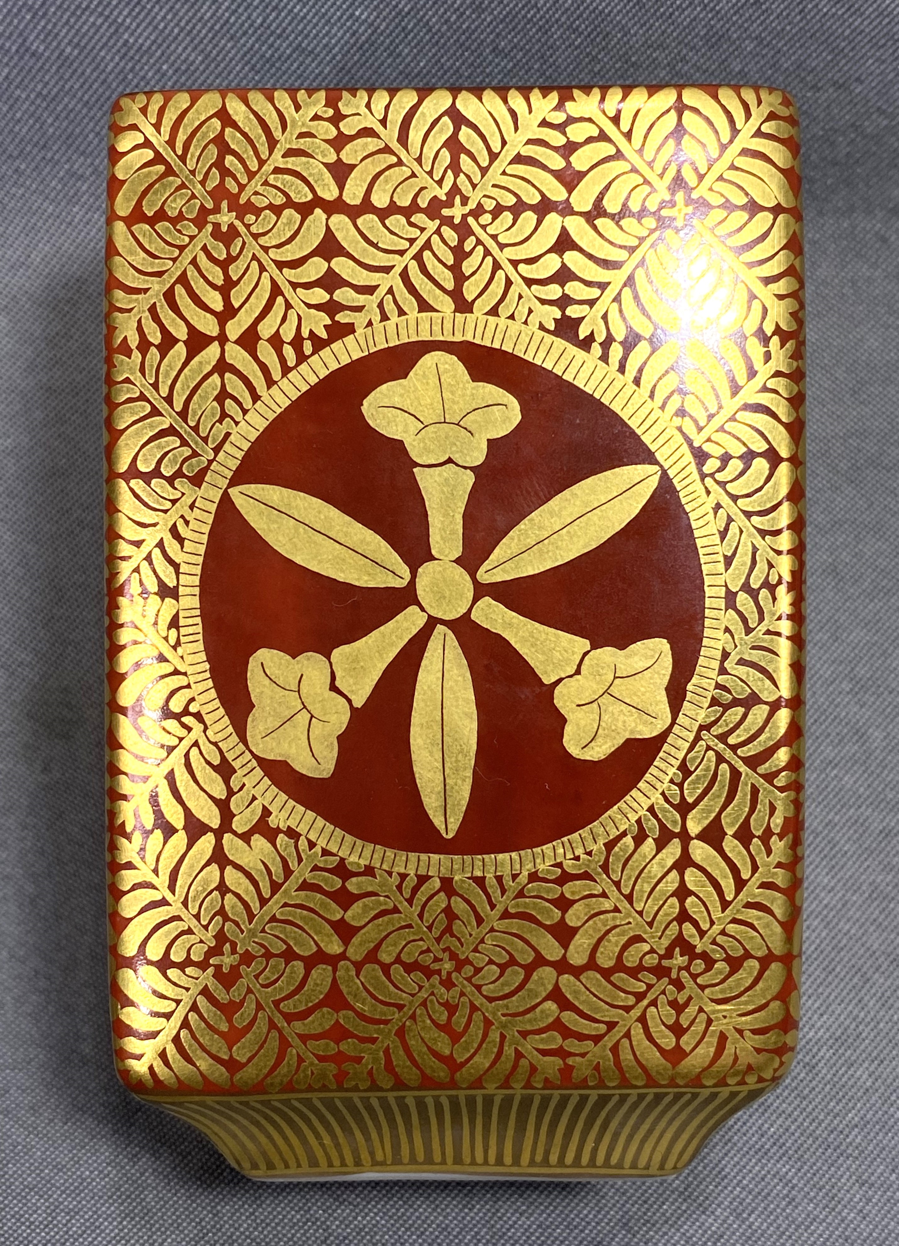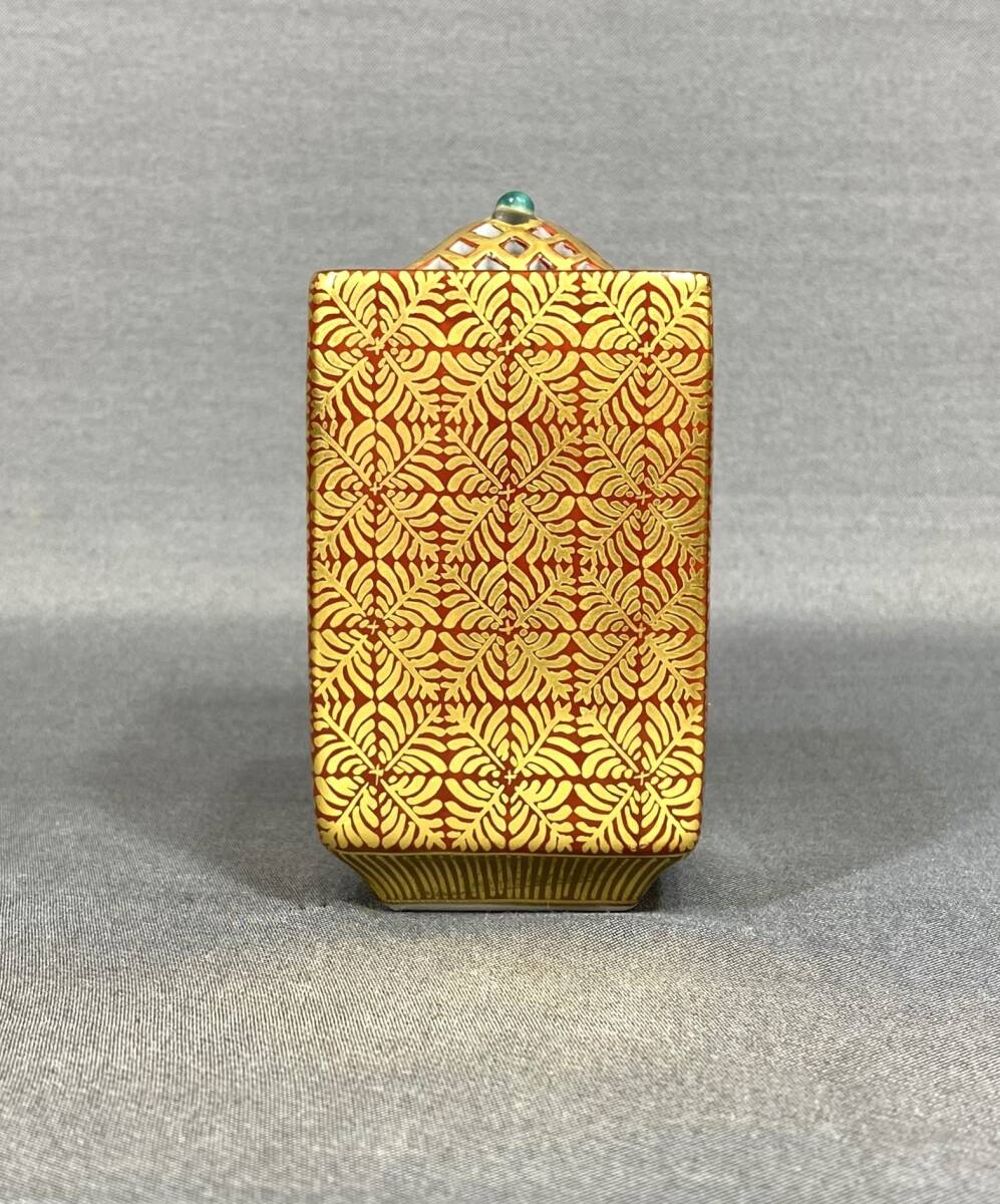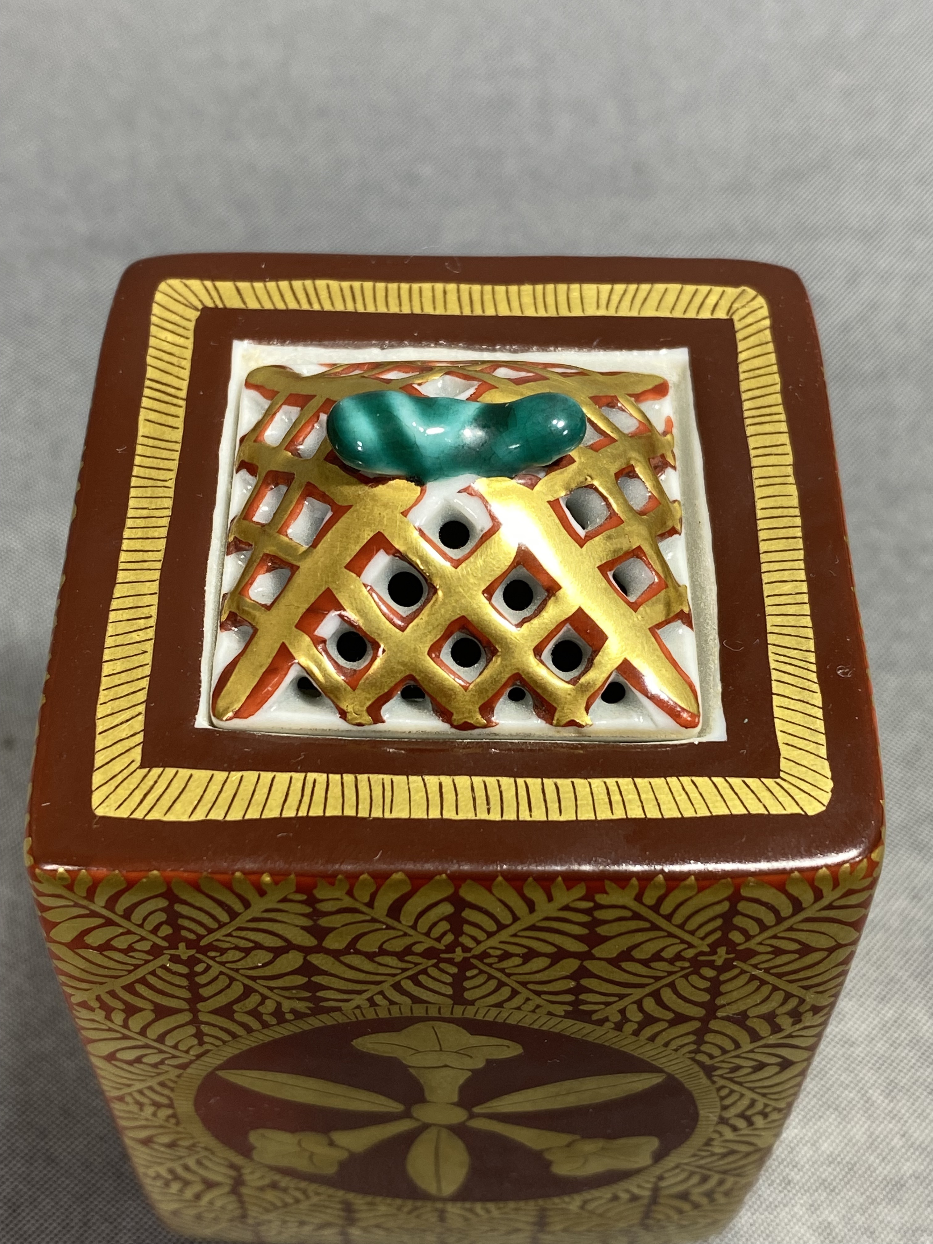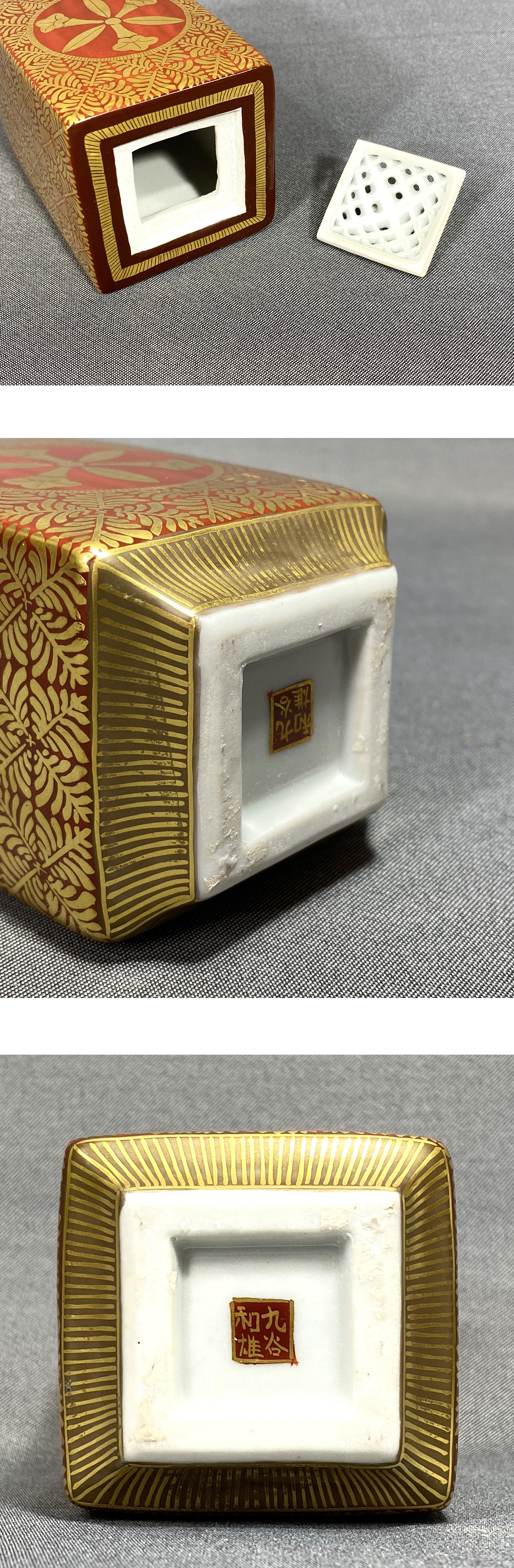 【風車】 人間国宝 九谷焼 中田一於(和雄) 赤絵 金彩 花葉文 透彫網形蓋 四角香炉▲金襴手▲色絵金彩