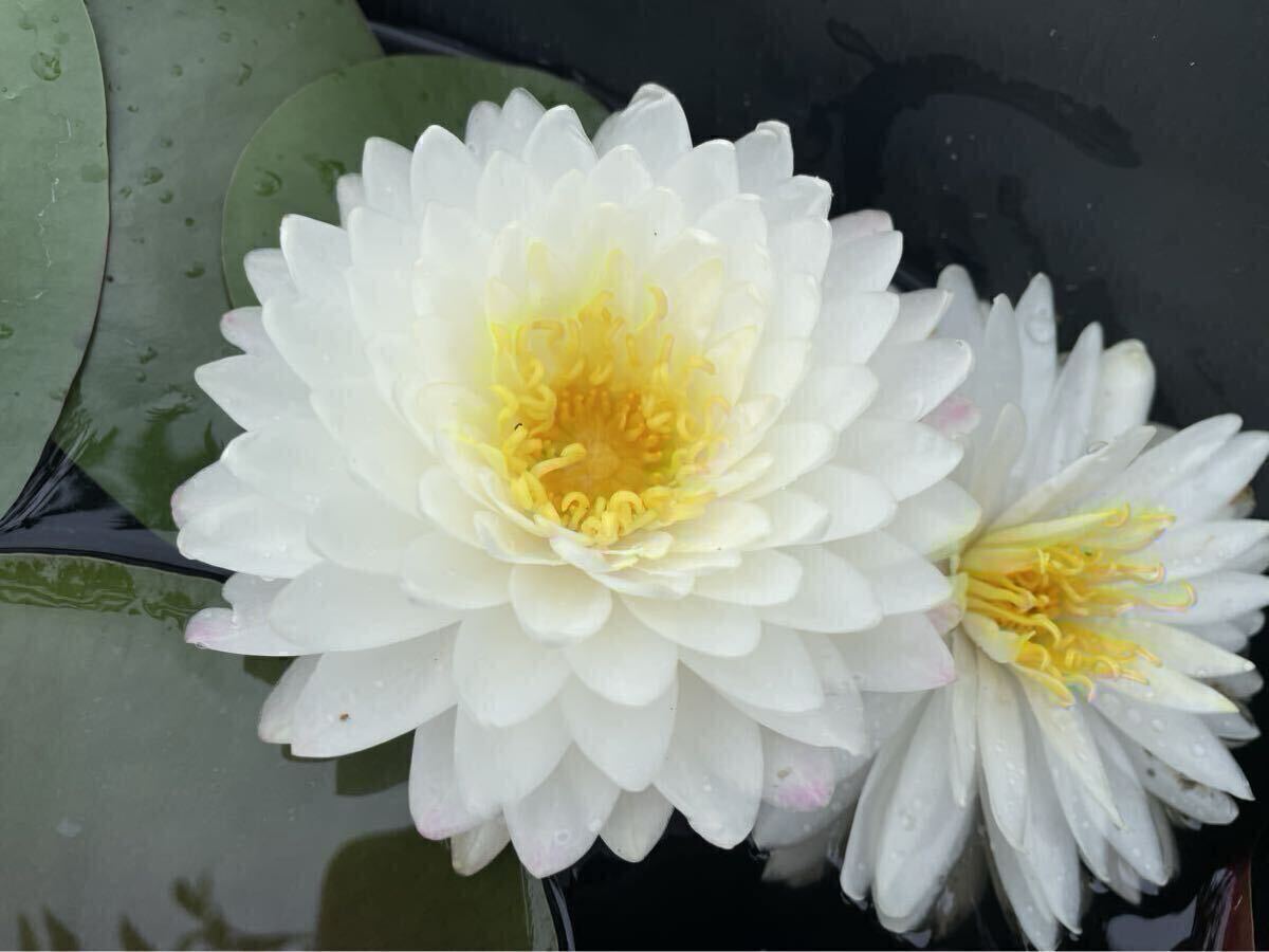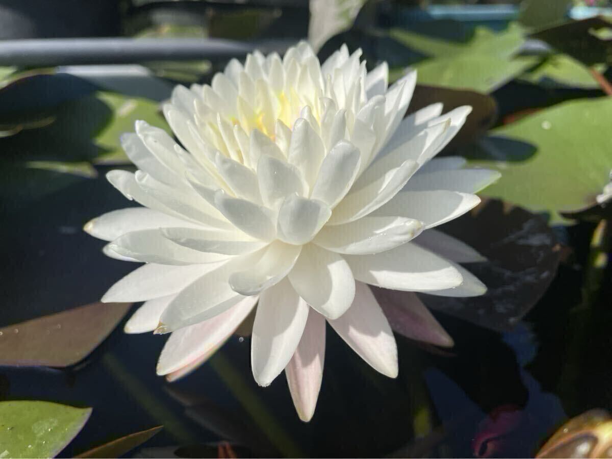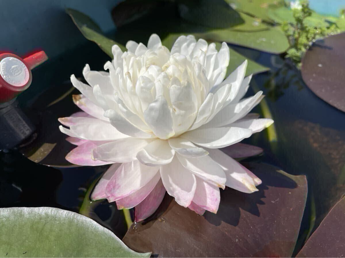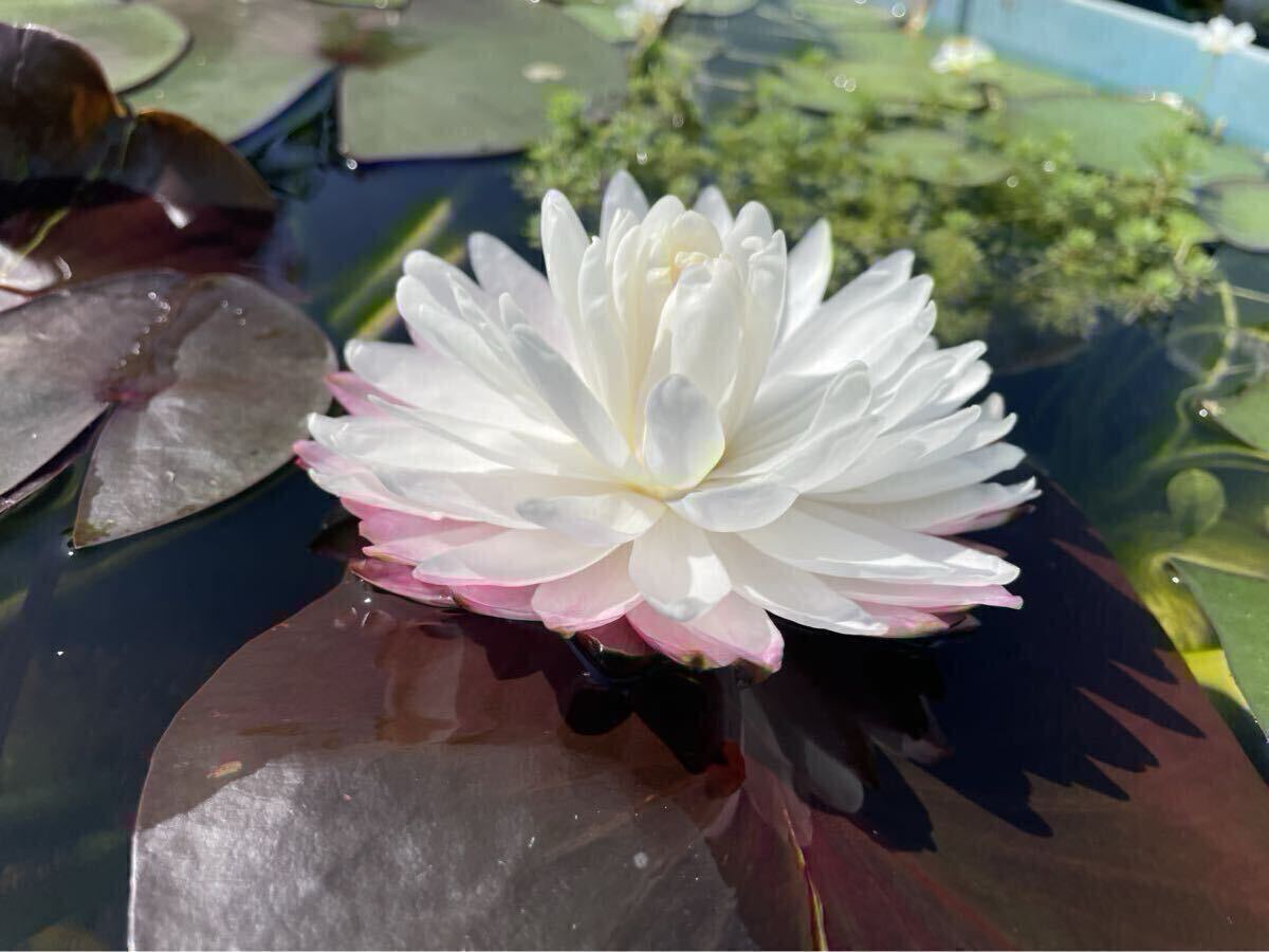 白の八重咲の睡蓮で一番の特徴は一番下の花弁がのみがピンク色になりとても美しいです。