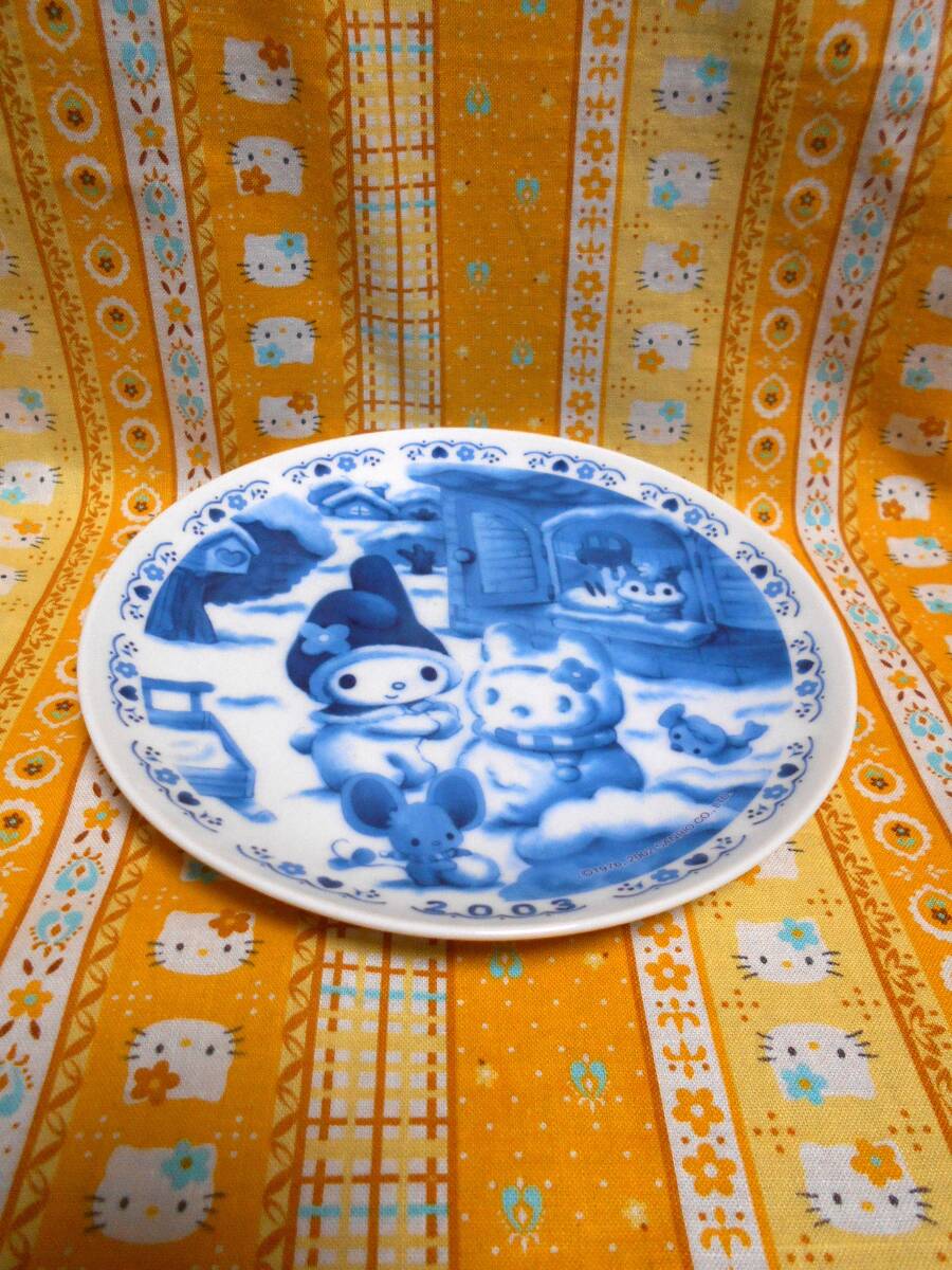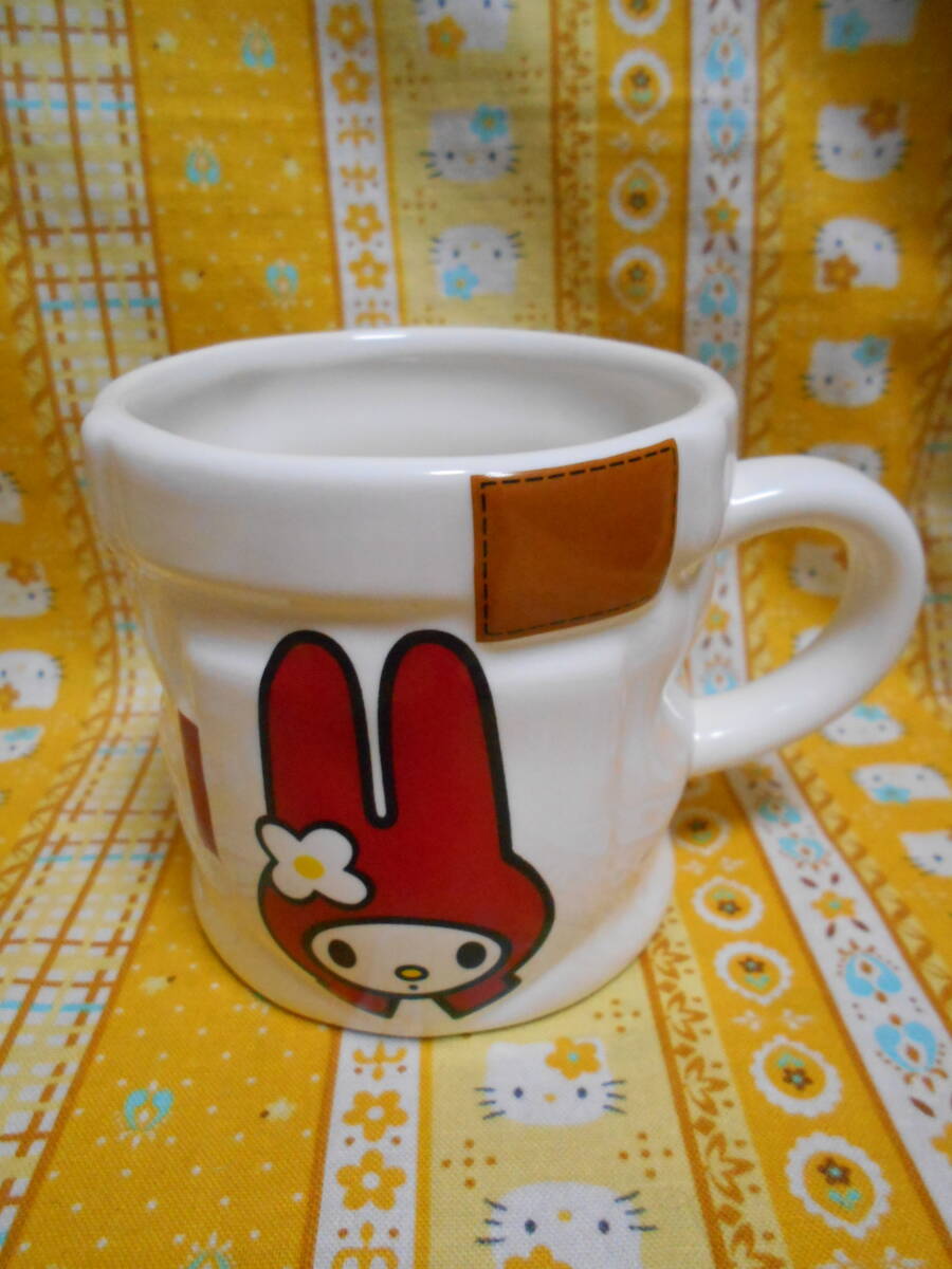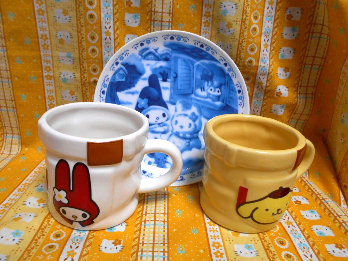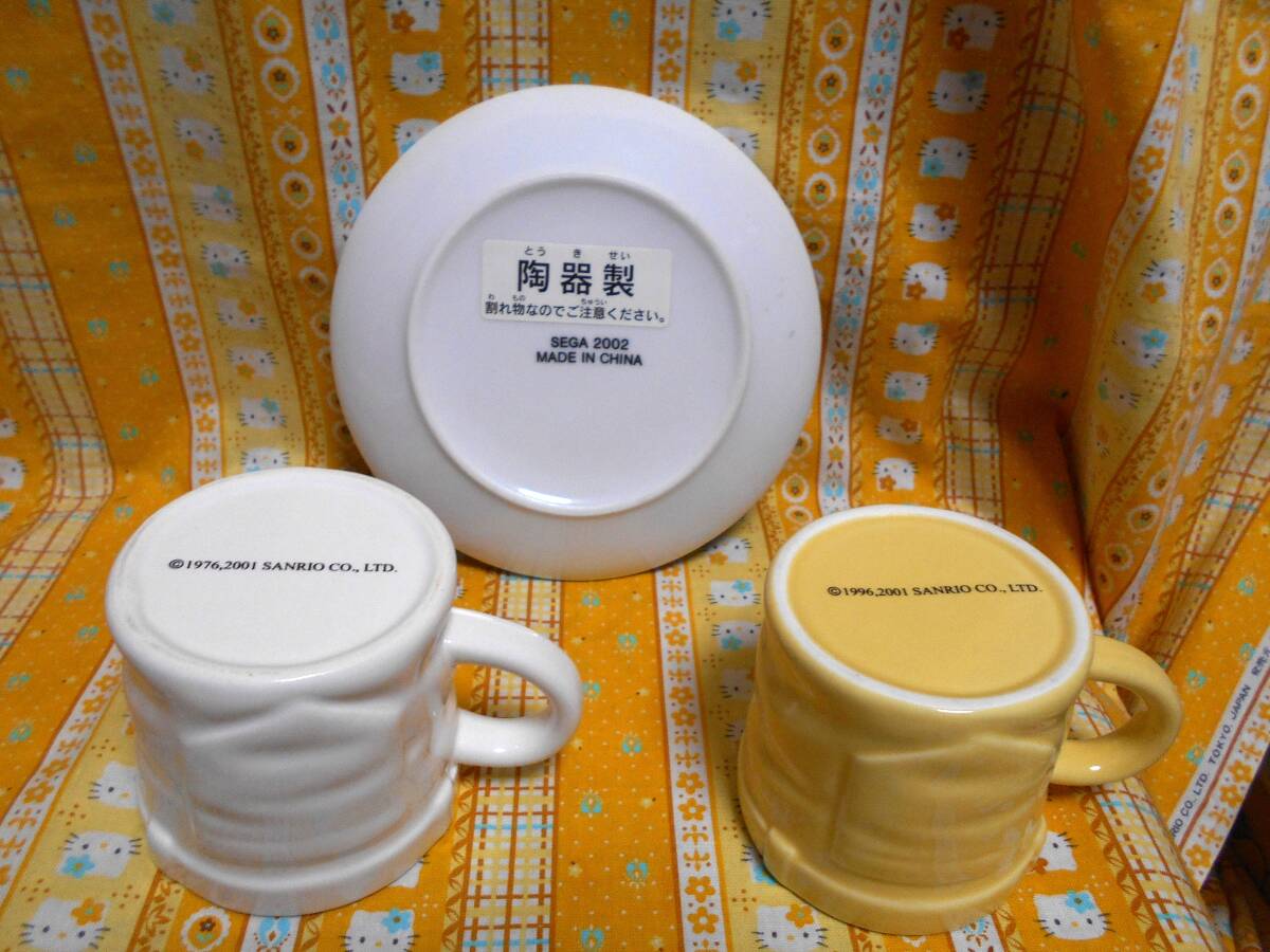 ♪マイメロディ新品タグシール付きサンリオ陶器製皿プレートセガ2002&陶器製ジーンズ仕様マグカップマイメロディ&ポムポムプリン2個2001
