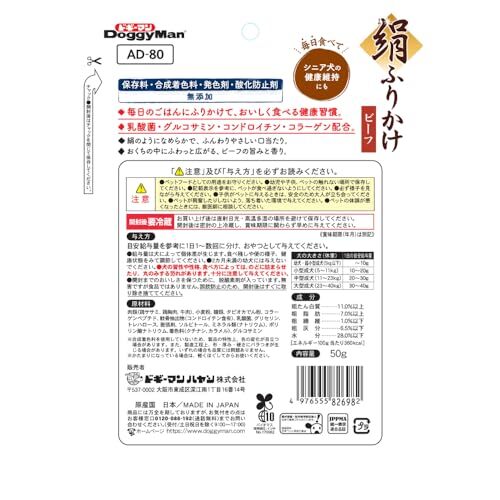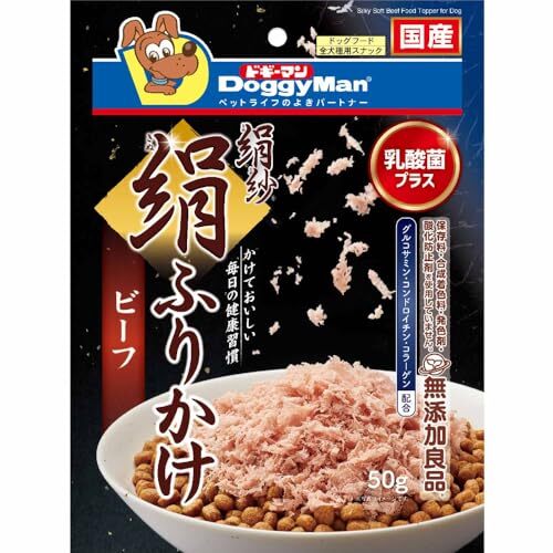 -/-/9002088224003・FlavorName:ビーフ・●ふくらしっとりで愛犬がよろこんで食べるビーフの絹紗でつくったふりかけ。・●ふっくらした形状でフードにトッピングしやすく、フードのすきまに落ち込みにくい。・●しっとりしていて鼻息などで舞い上がりにくくおいしい食感。・●毎日ふりかけて健康維持。乳酸菌、コンドロイチン、グルコサミン、コラーゲンを配合。・●保存料・合成着色料・発色剤・酸化防止剤不使用。安心の無添加良品品質。