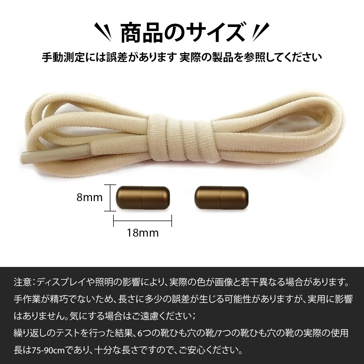 | ご注意 | 1. 通常の伸縮性のない靴紐や丸く太い靴紐には使用できません。 2. 手工測定にはわずかな誤差がありますので、ご理解ください。 3. ディスプレイや照明の影響により、実際の色が画像と若干異なる場合があります。 |