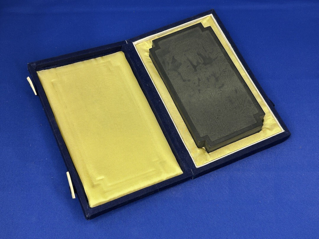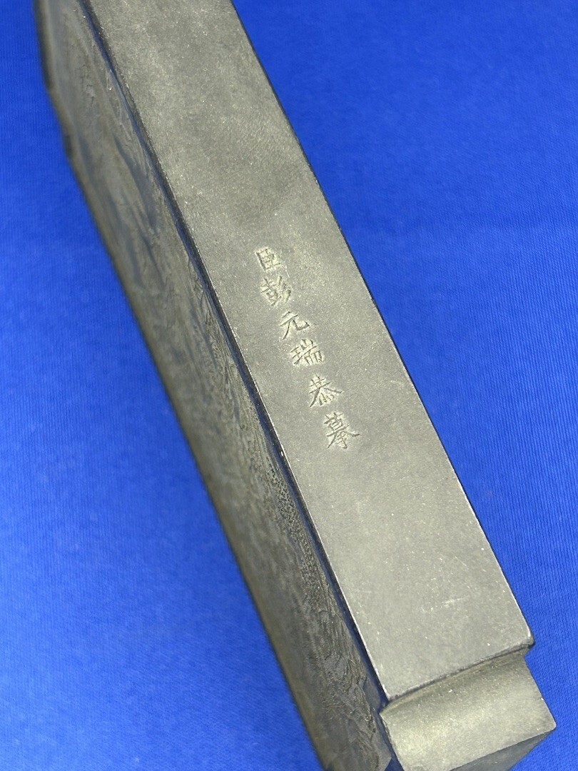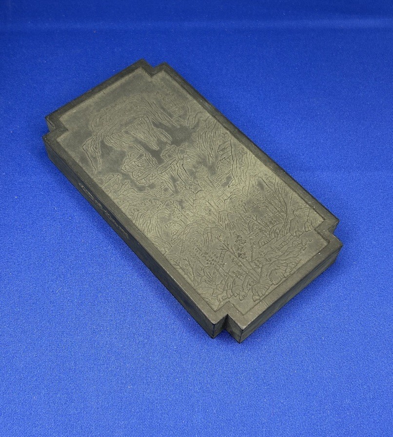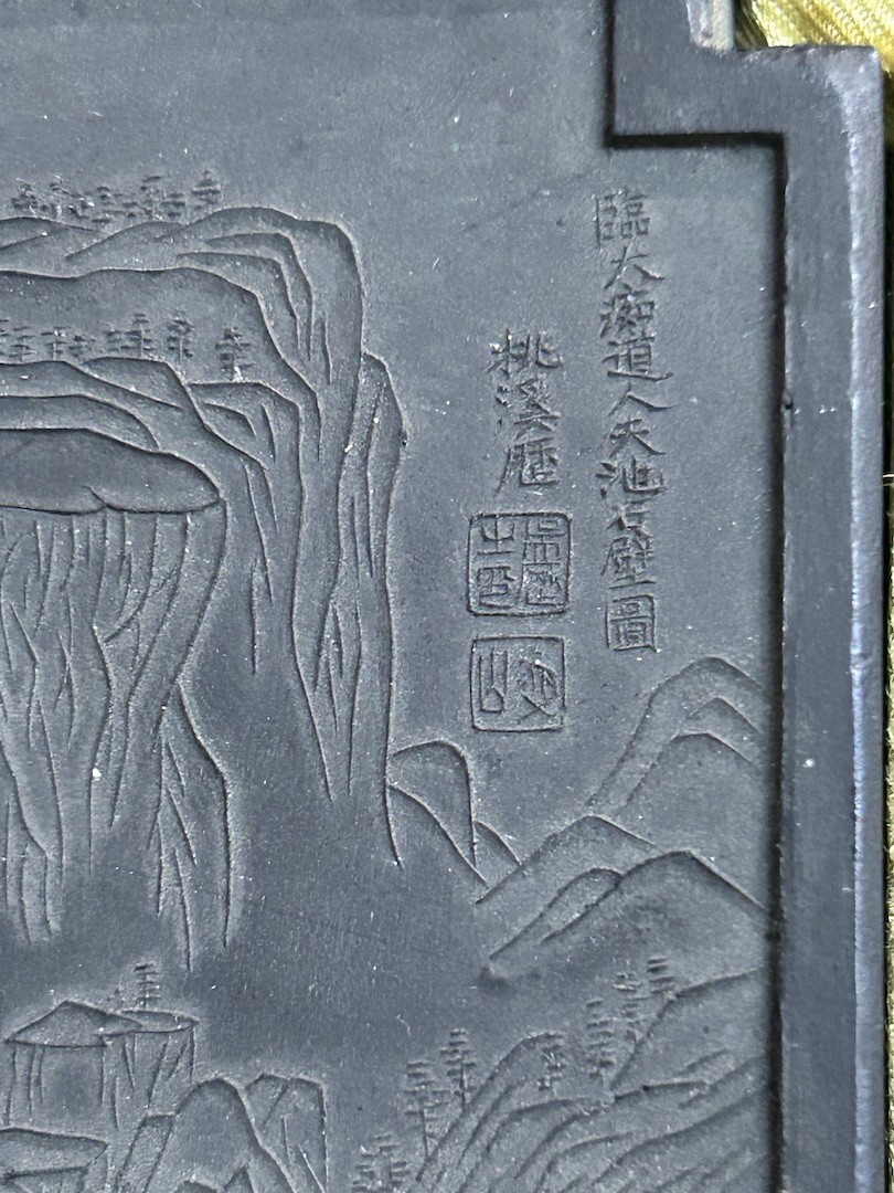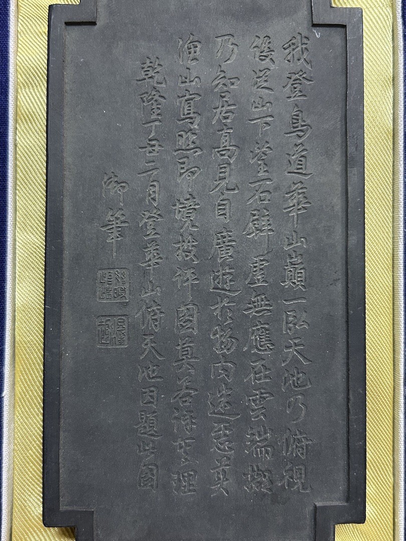 「中国 硯石(刻文絵有)」 (表)臨大痴道人天池石壁図 (裏)我登鳥道〜 (側面)大清乾隆年製・臣彭元瑞恭 |