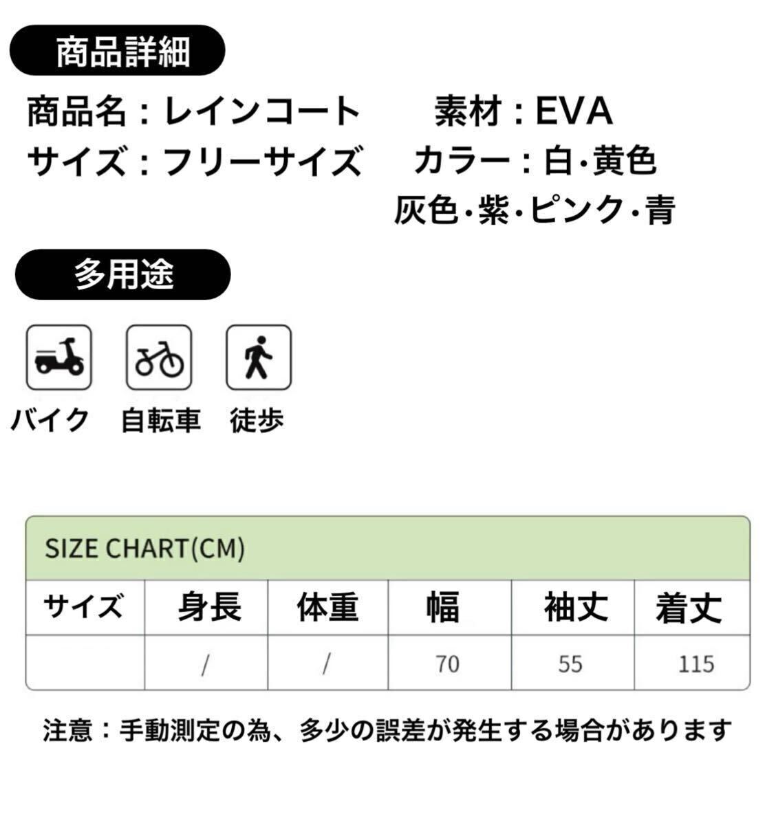 多用途に使えるEVAレインコートは、雨の日の必需品です。防水性に優れた厚手のEVA素材を使用しており、外部の水分からしっかりと身を守ります。フード付きデザインは機能性だけでなく、スタイリッシュな見た目も演出。 男女兼用で、幅広い体型にフィットする設計となっているため、誰でも気軽に着用することができます。アウトドアイベントや通勤・通学時にも大活躍間違いなしです