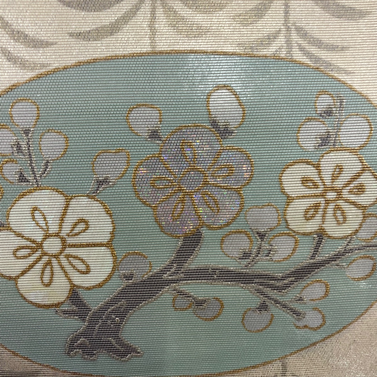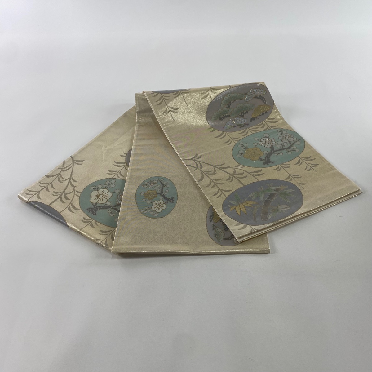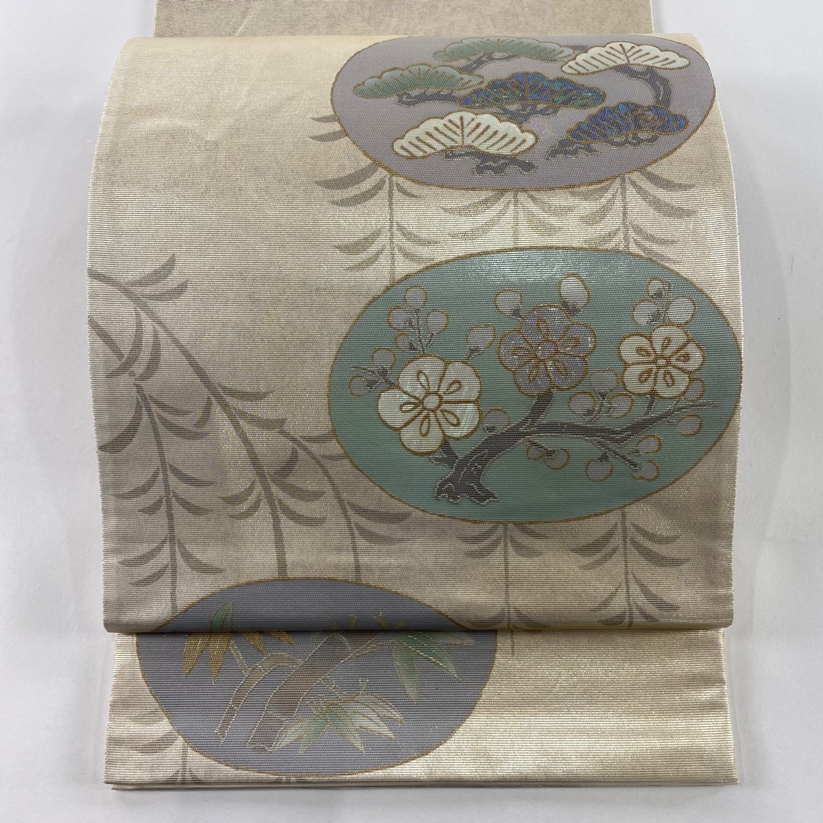 | 袋帯 秀品 松竹梅 箔 金銀彩 ベージュ お太鼓柄 正絹 【中古】 |