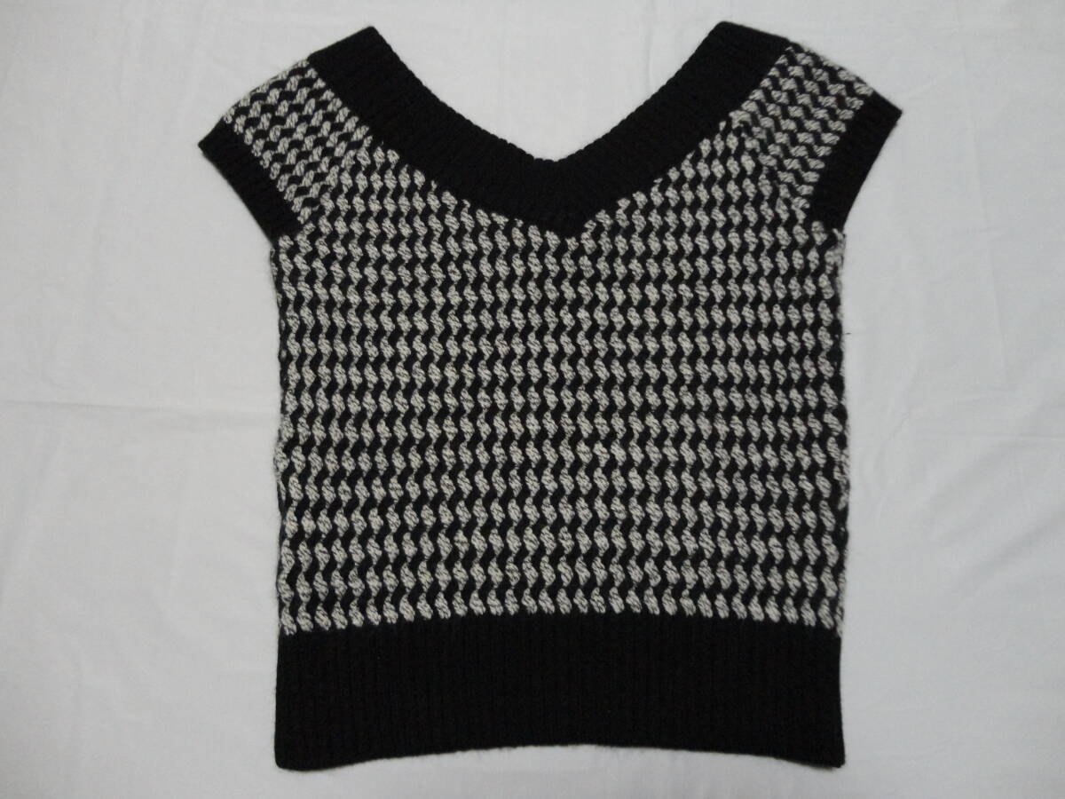 口のブラックラインに、変則チェック柄が、可愛く上品で印象的な、日本製のノースリーブニットセーターです。