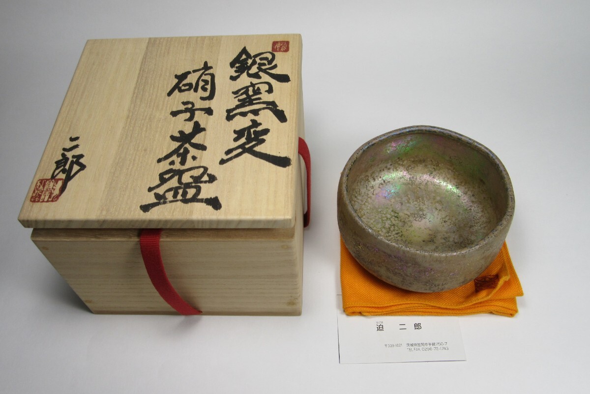 商品名 : 迫二郎。銀窯変硝子茶碗(共箱、共布、栞)。