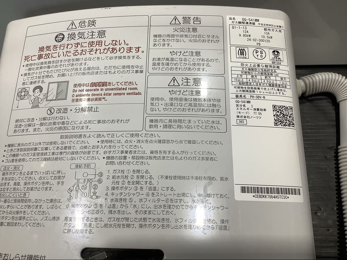 商品名:NORITZ ノーリツ 都市ガス用 ガス瞬間湯沸器 GQ-541MW 2024年製 給湯器 瞬間湯沸かし器 動作確認済み 中古品 HI100302