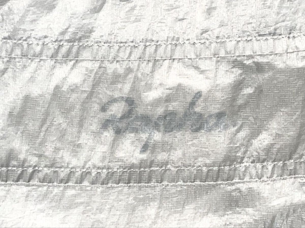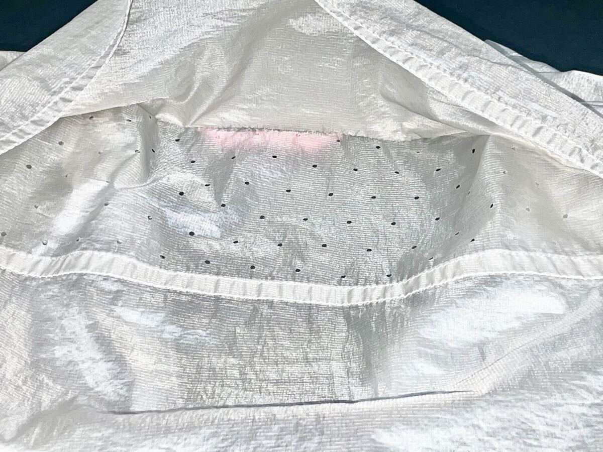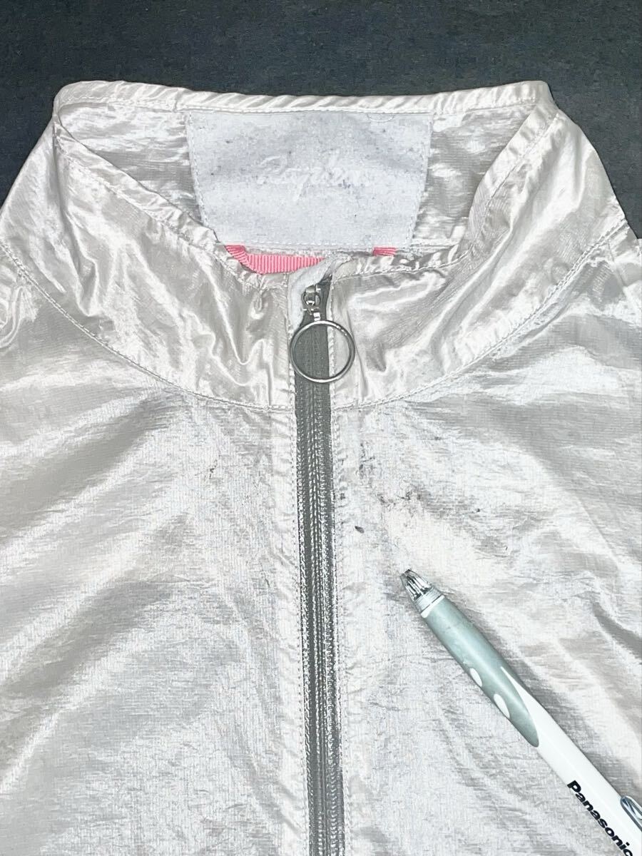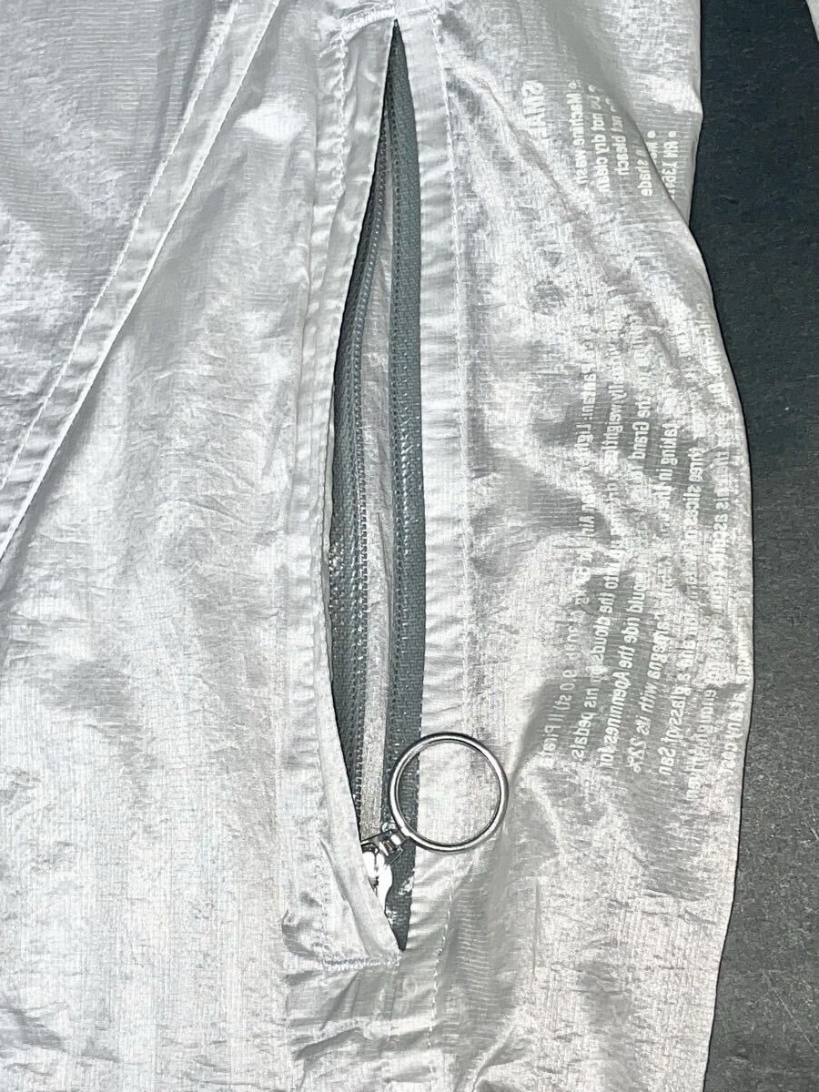 ◇さほど使用感のないお品です。Raphaラファのウィンドブレーカー、透け感のある薄グレーでトップスのプリントが見える仕様です。背中、脇下には風を通すメッシュがございます。左腕のロゴ入りのラインが特徴的です。左右にファスナーポケット、左腕と後裾にロゴがございます。