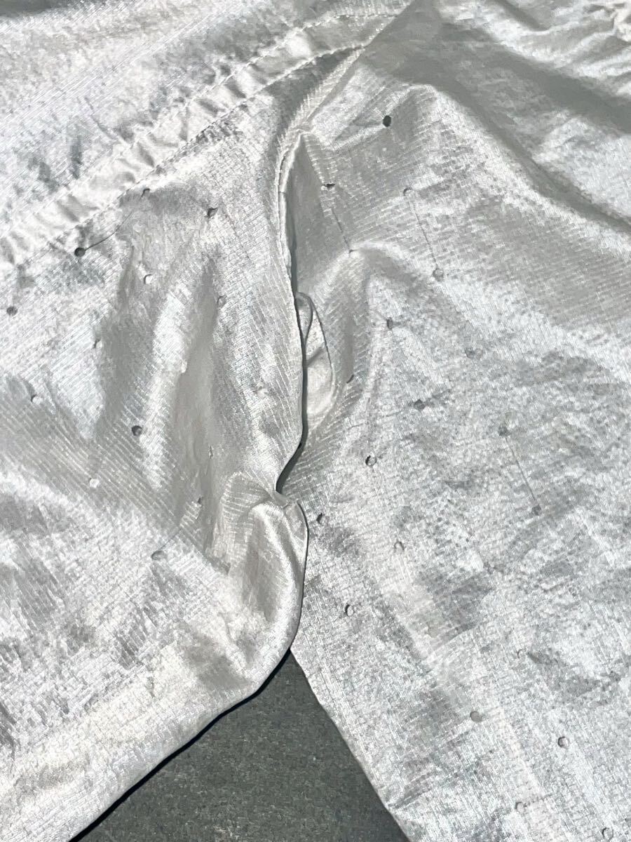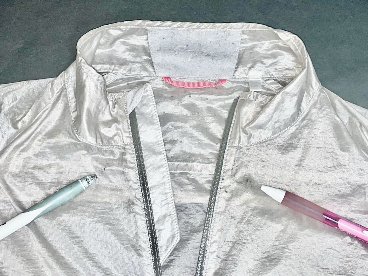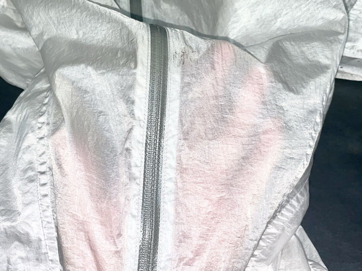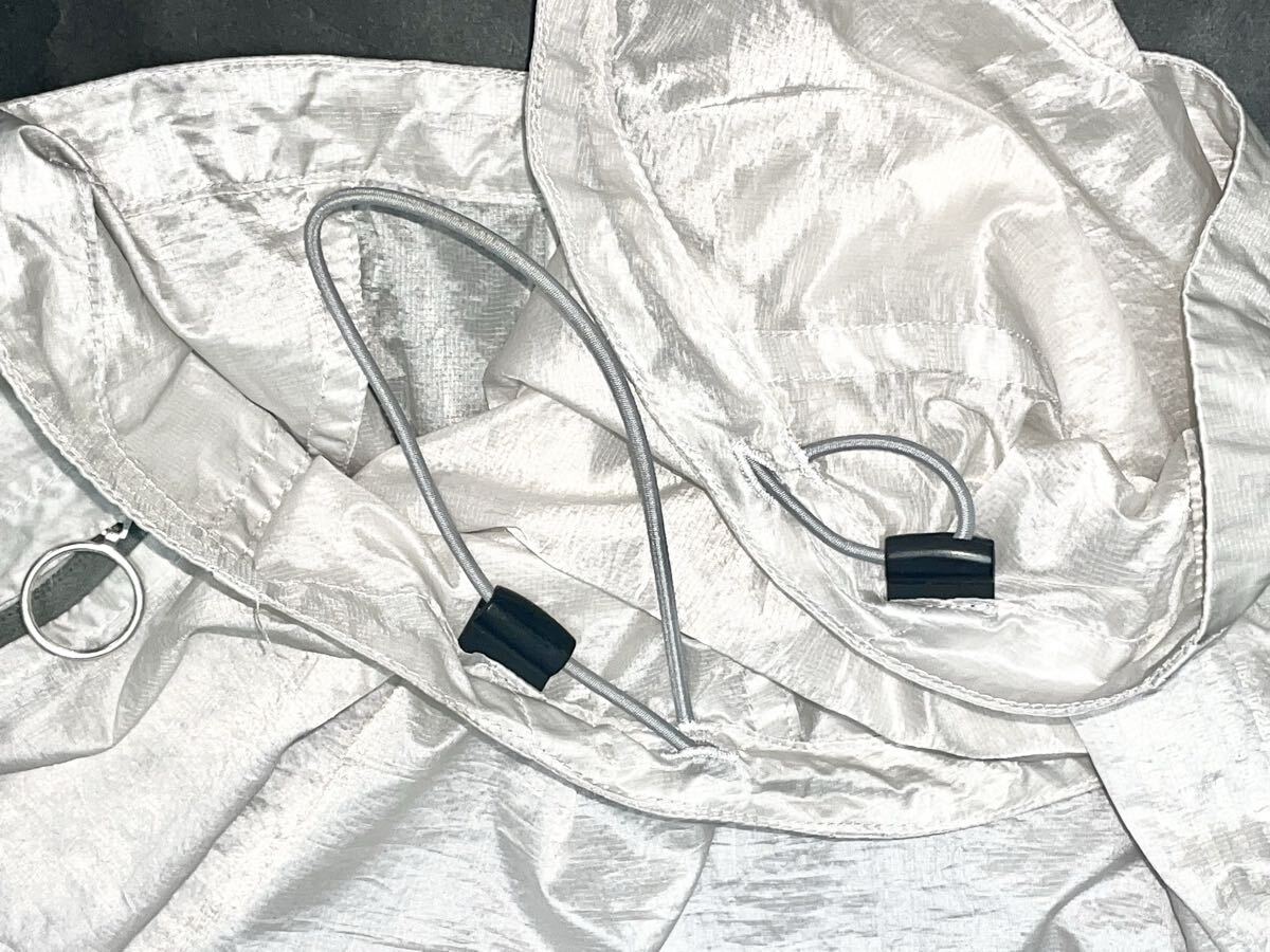 ◇さほど使用感のないお品です。Raphaラファのウィンドブレーカー、透け感のある薄グレーでトップスのプリントが見える仕様です。背中、脇下には風を通すメッシュがございます。左腕のロゴ入りのラインが特徴的です。左右にファスナーポケット、左腕と後裾にロゴがございます。