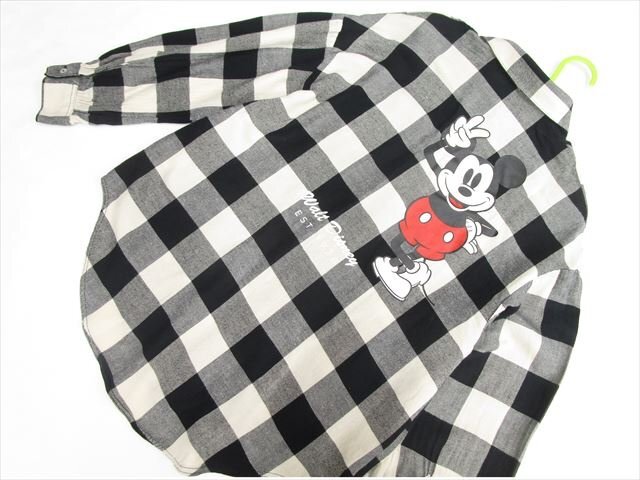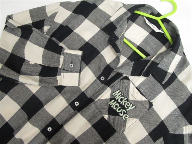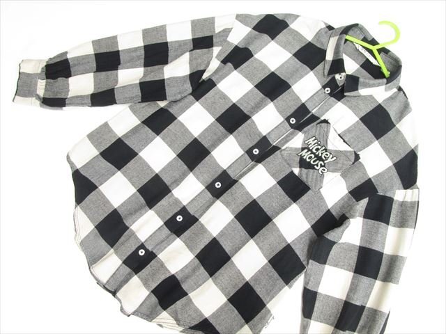 ドロップショルダー 長袖 シャツ US:14 ブラック×アイボリー チェック柄 グリーン系 英字&ミッキーマウス プリント【メール便可】