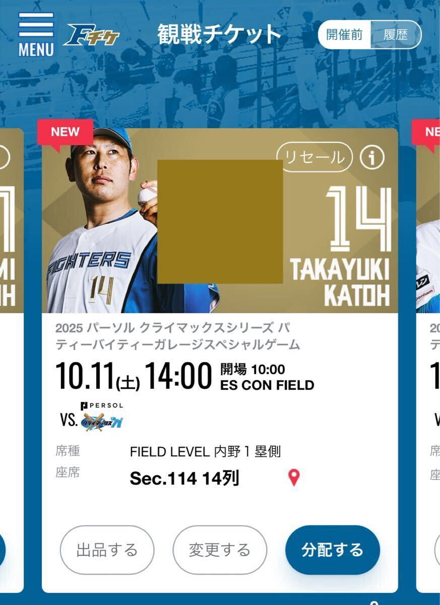 10/11 ファイターズ パーソル クライマックスシリーズ パ CS エスコンフィールド北海道開催のチケットです。