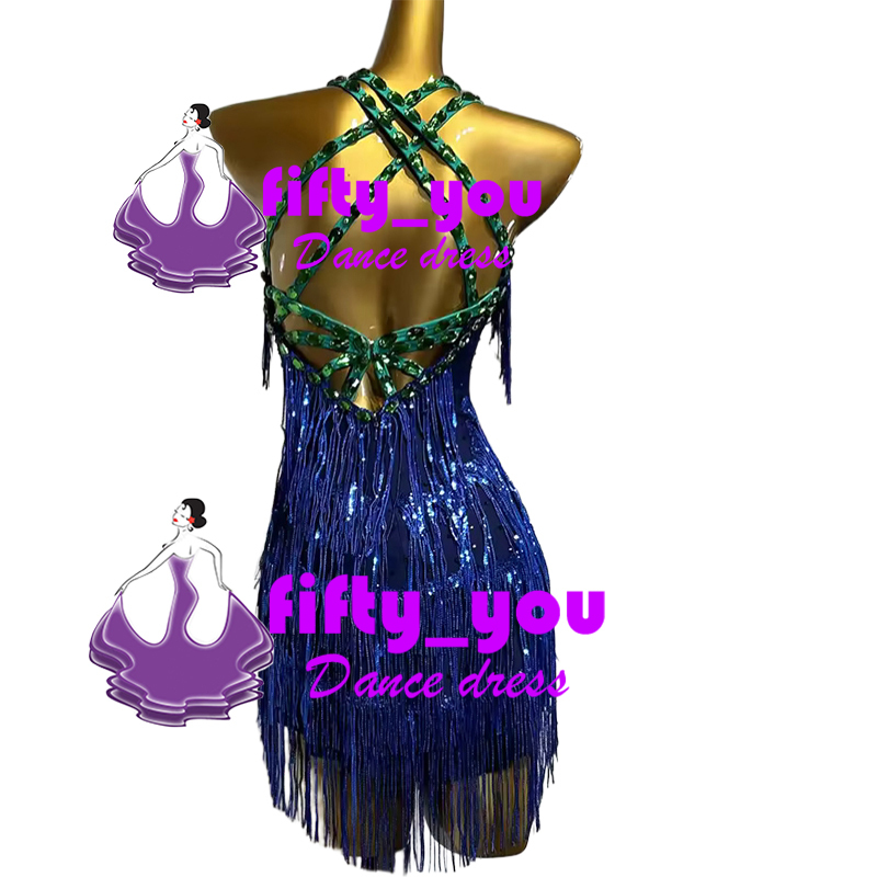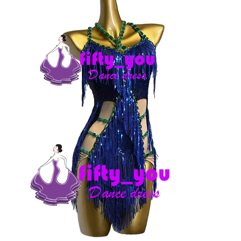 新品fifty_youオリジナル商品レディース社交ダンス衣装  競技パーティ用ドレス  セミオーダー良品 ラテンドレス 上品デザイン ネイビー