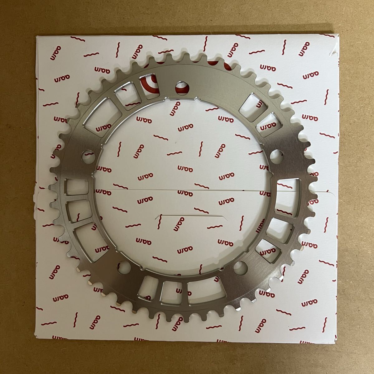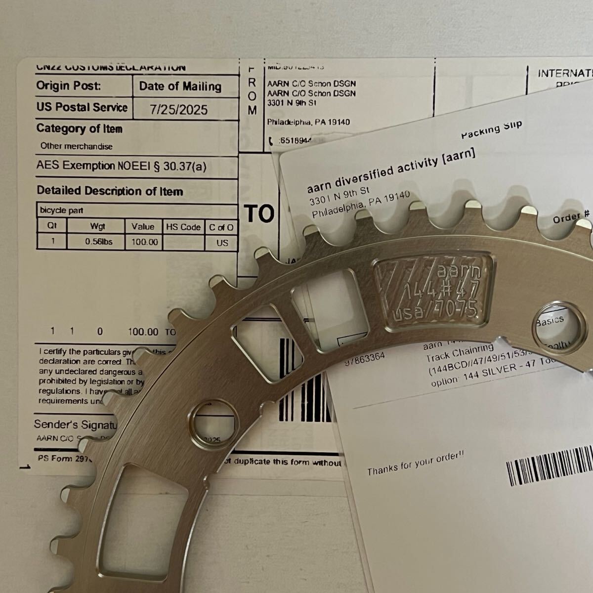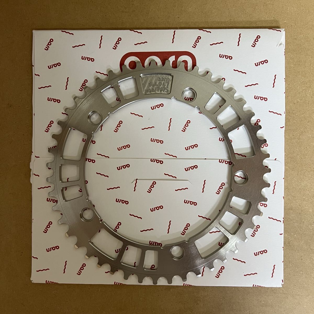 The standard in high-quality designer track bicycle chainrings since 2008, these rings feature a unique tooth profile designed for maximum engagement and minimal wear. Manufactured in California, USA, from certified 7075-T6 aluminum plate stock. These chainrings are fully CNC machined. All edges (front and rear) are machine broken with a 45-degree 0.010-in deep chamfer. Product is packaged in a custom letterpress printed envelope. More details and product photos are available at 44rn.com