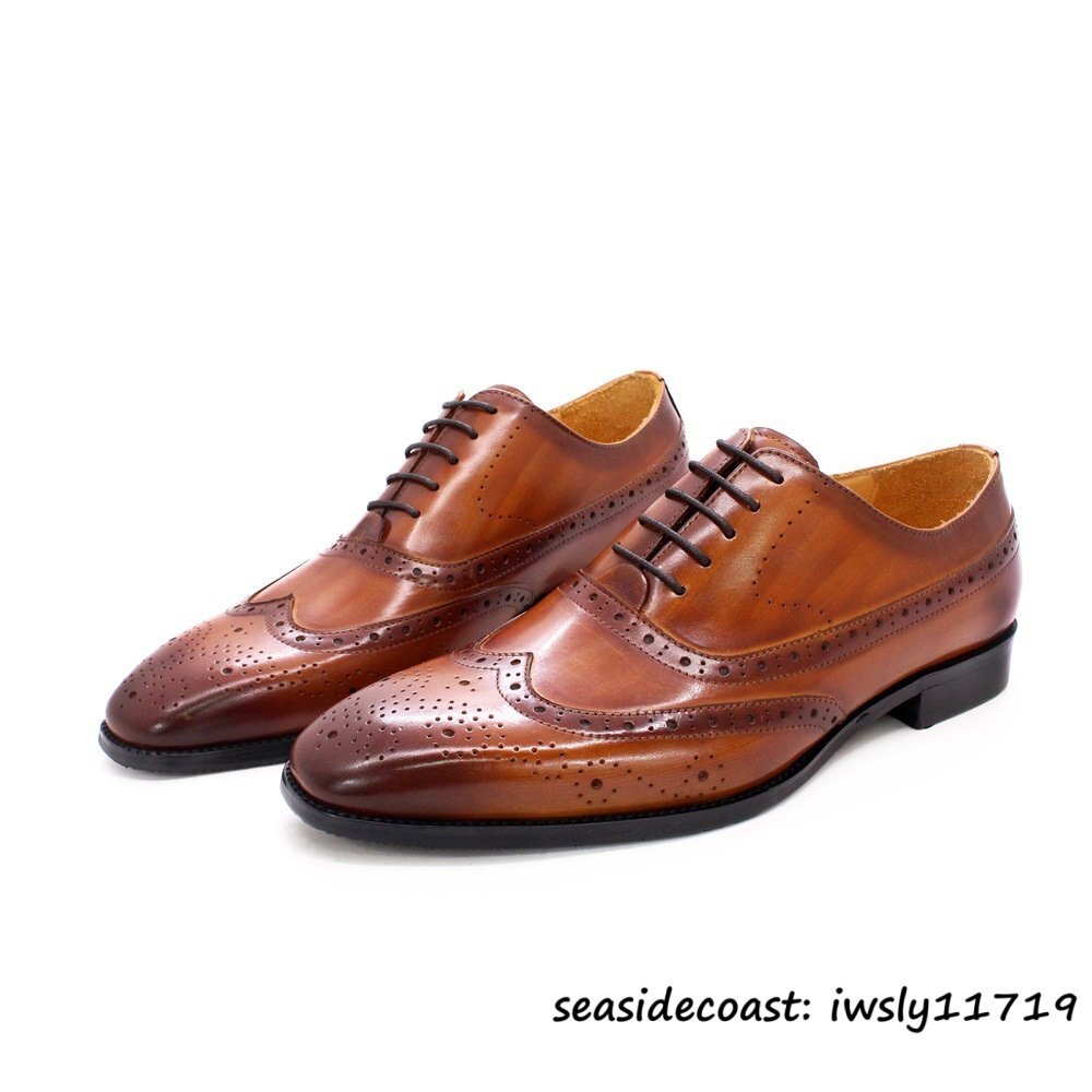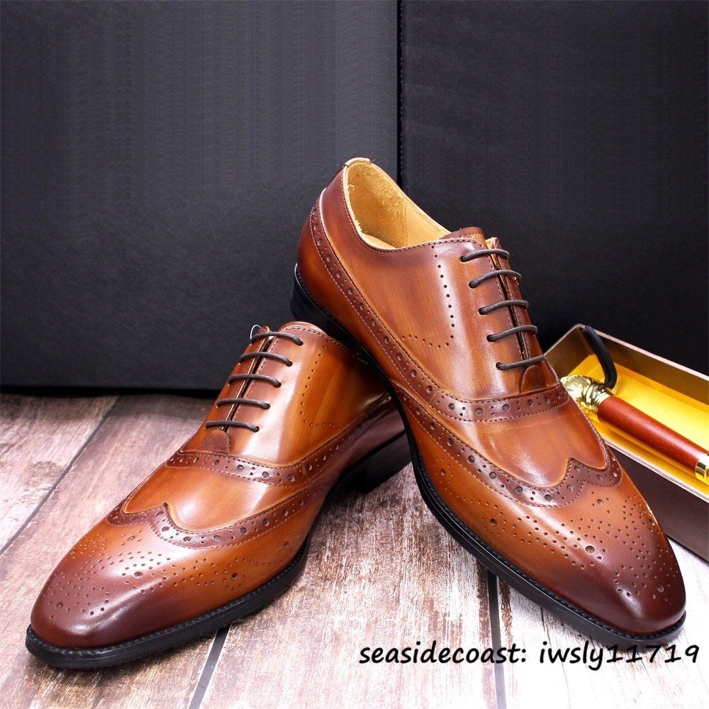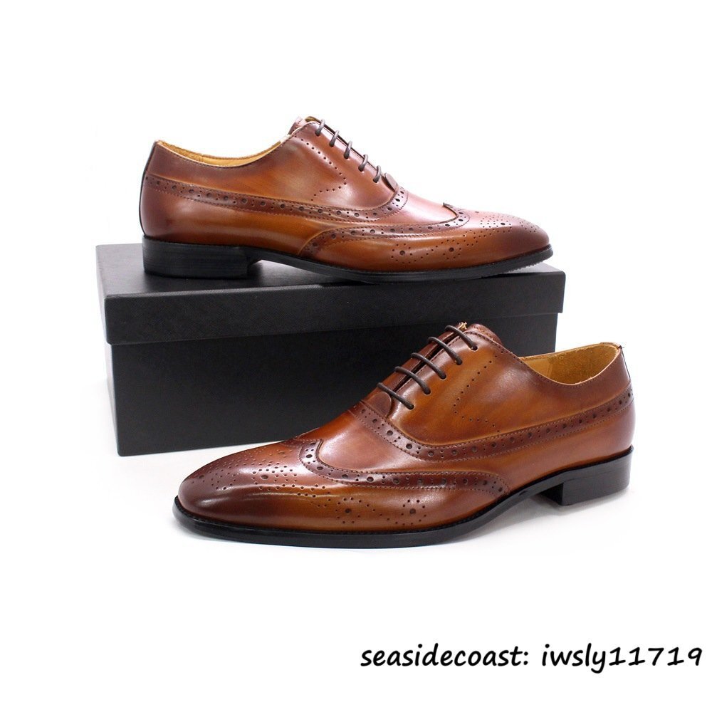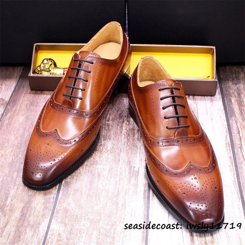 最高級★レザーシューズ メンズ ビジネスシューズ 本革 職人手塗仕上げ 彫り 紳士靴 フォーマル 上質牛革 革靴 イギリス風 ブラウン 25.5cm