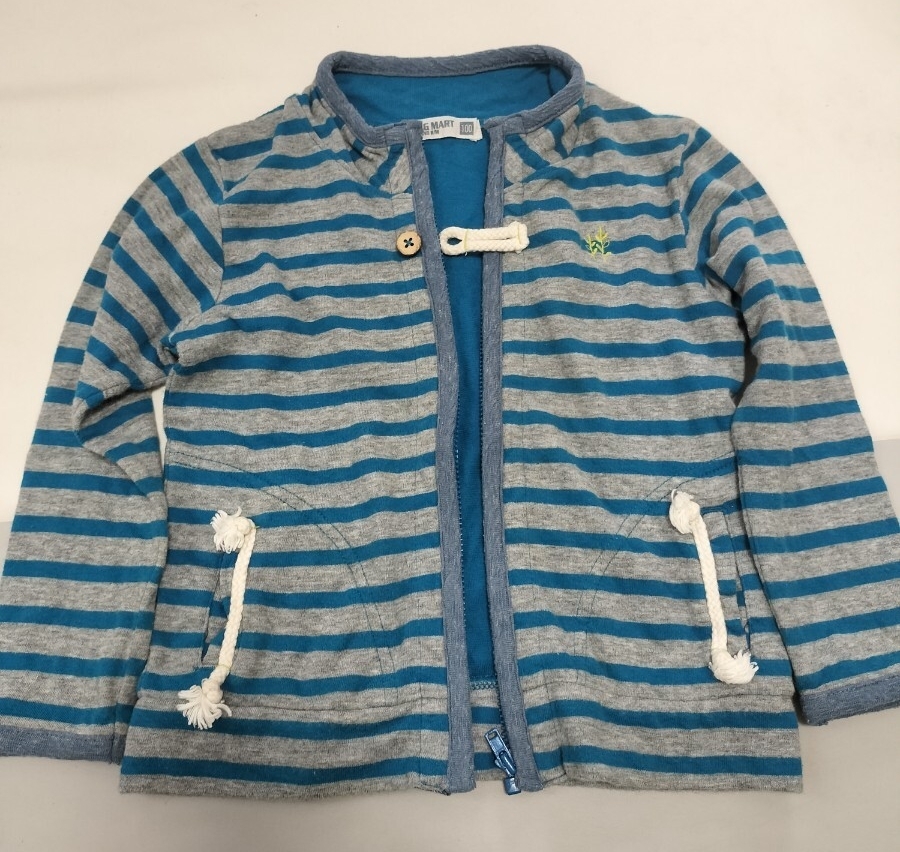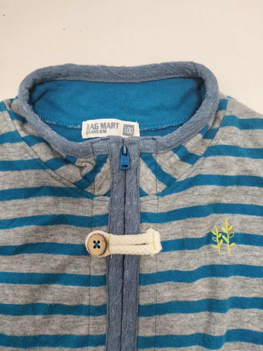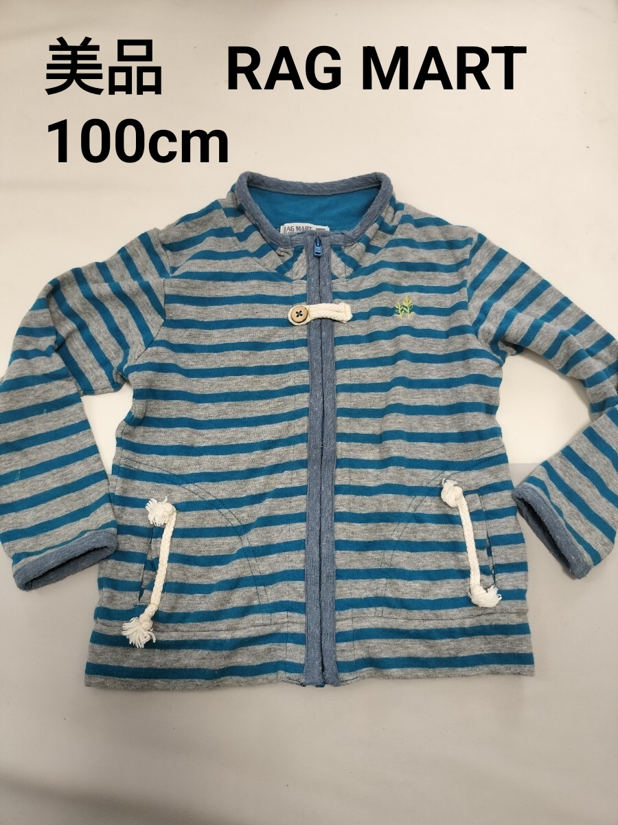 RAG MART(ラグマート)のボーダー柄ジップアップパーカーです。明るいブルーとグレーのボーダーが特徴で、フロントのトグルボタン風の飾りとポケットの紐がアクセントになっています。肌寒い日の羽織りものとして活躍します。