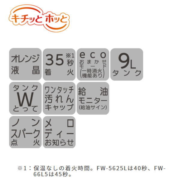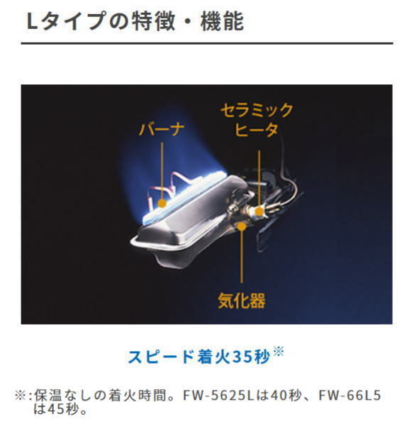 ●消費電力(50/60Hz):大火力時 190/190W / 小火力時 80/80W / 最大(点火時)410/410W / 待機時 1.0/1.0W