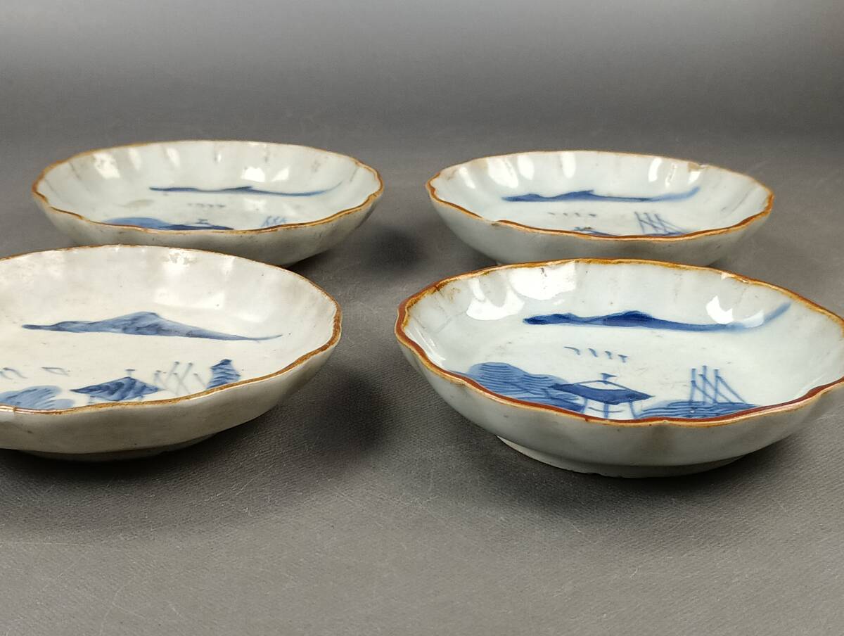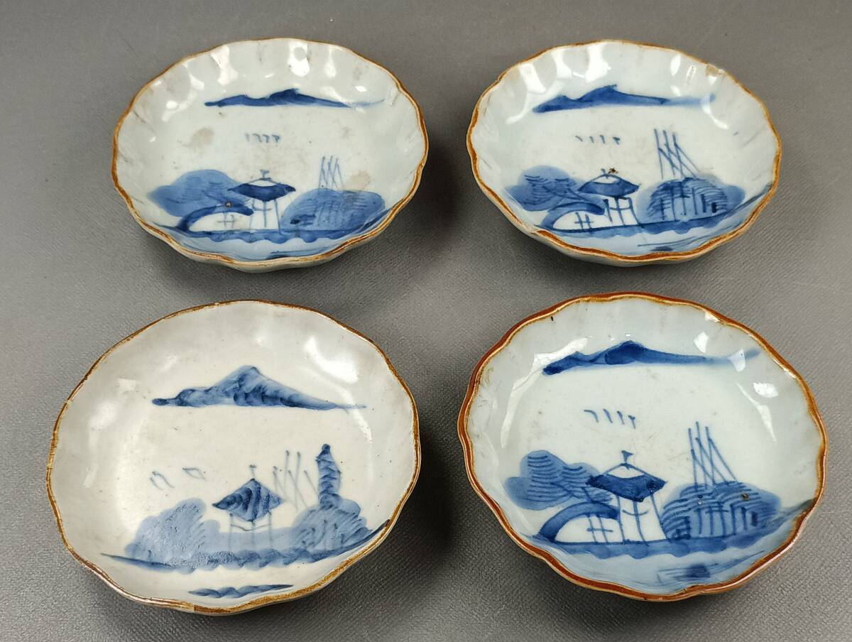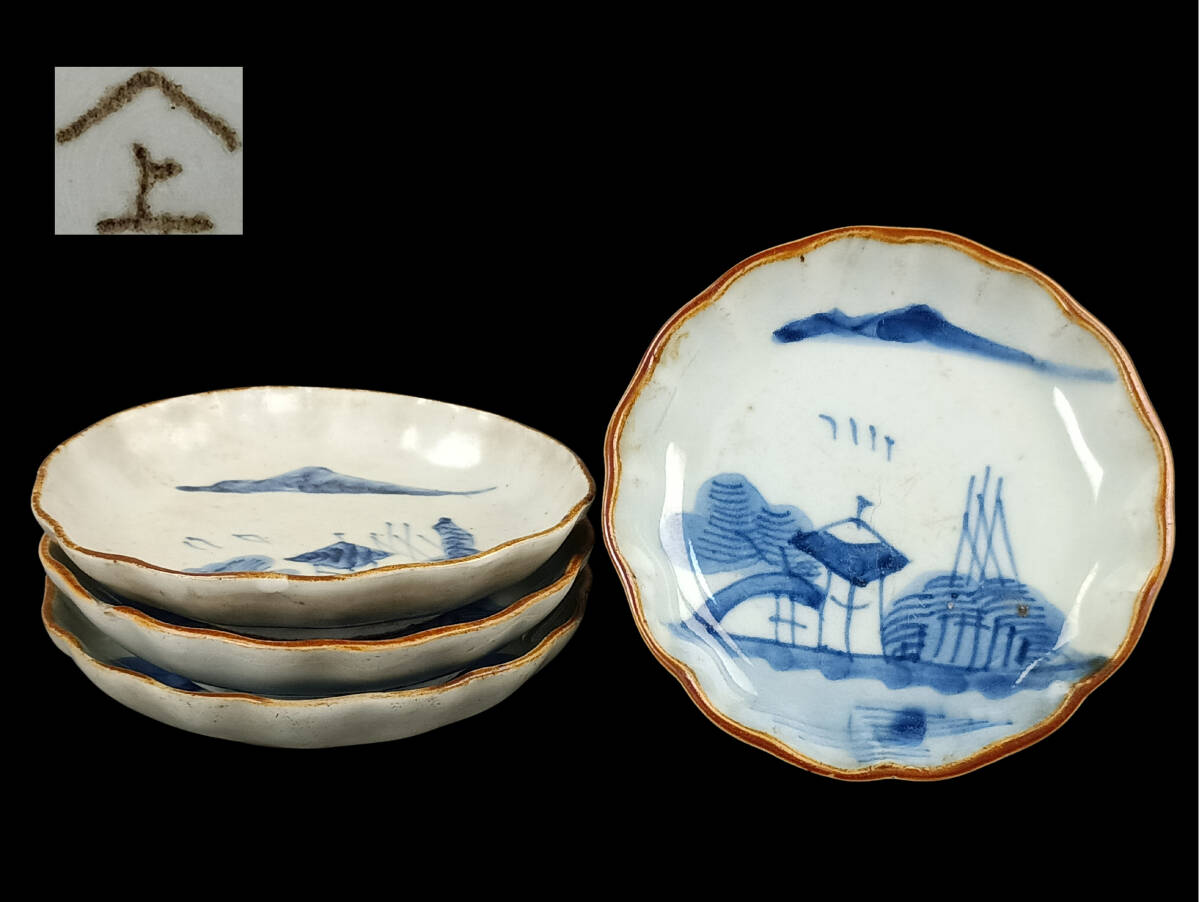 【忠古堂】古伊万里 染付 小皿 4客 天塩皿 青花山水図 口紅 江戸後期 古美術 古道具 j-246