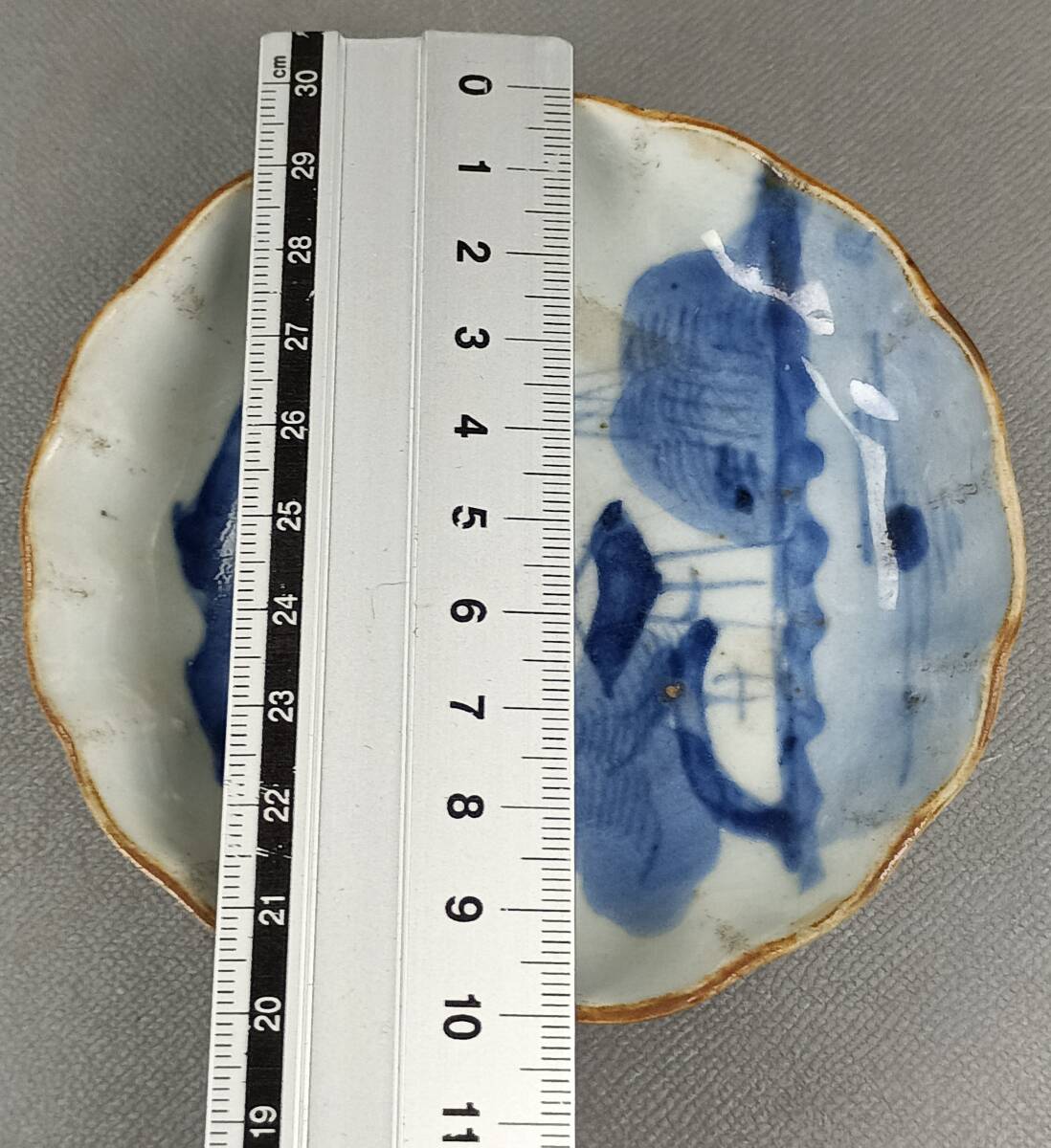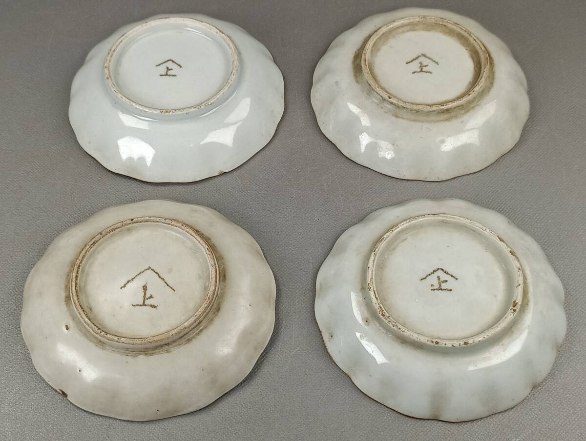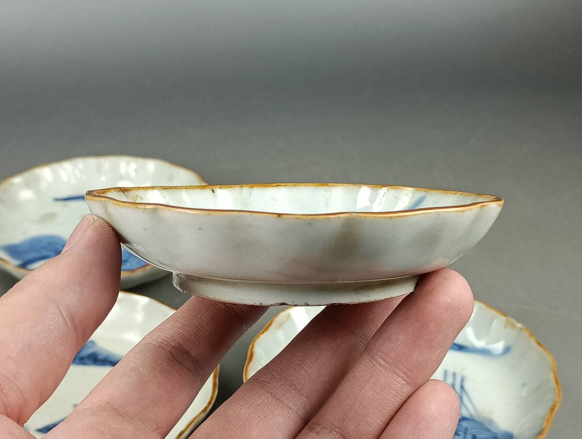 【忠古堂】古伊万里 染付 小皿 4客 天塩皿 青花山水図 口紅 江戸後期 古美術 古道具 j-246