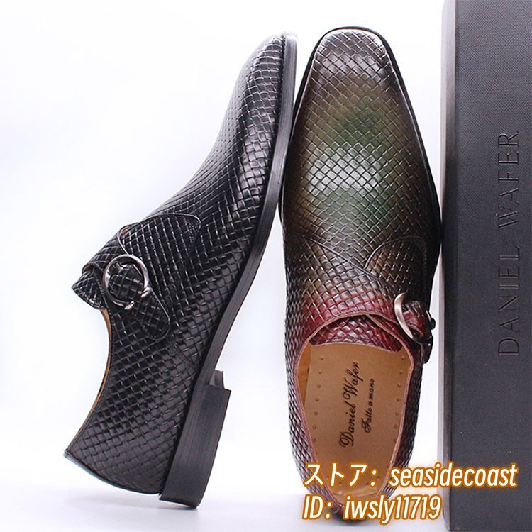 超希少◆モンクストラップ 本革 ビジネスシューズ メンズ 編み込み レザーシューズ 職人手塗り上げ 紳士靴 革靴 宴会 フォーマル 緑 24.5cm