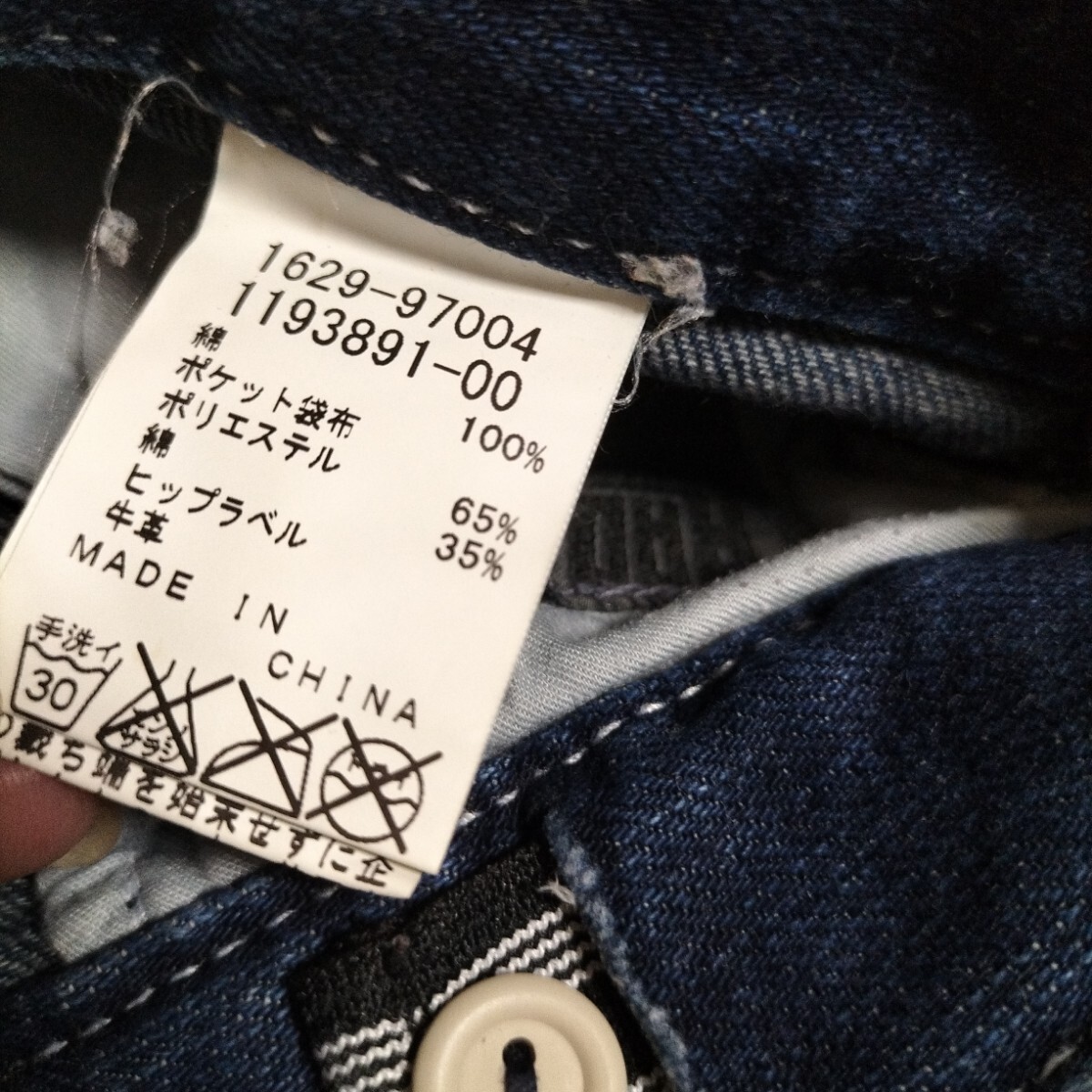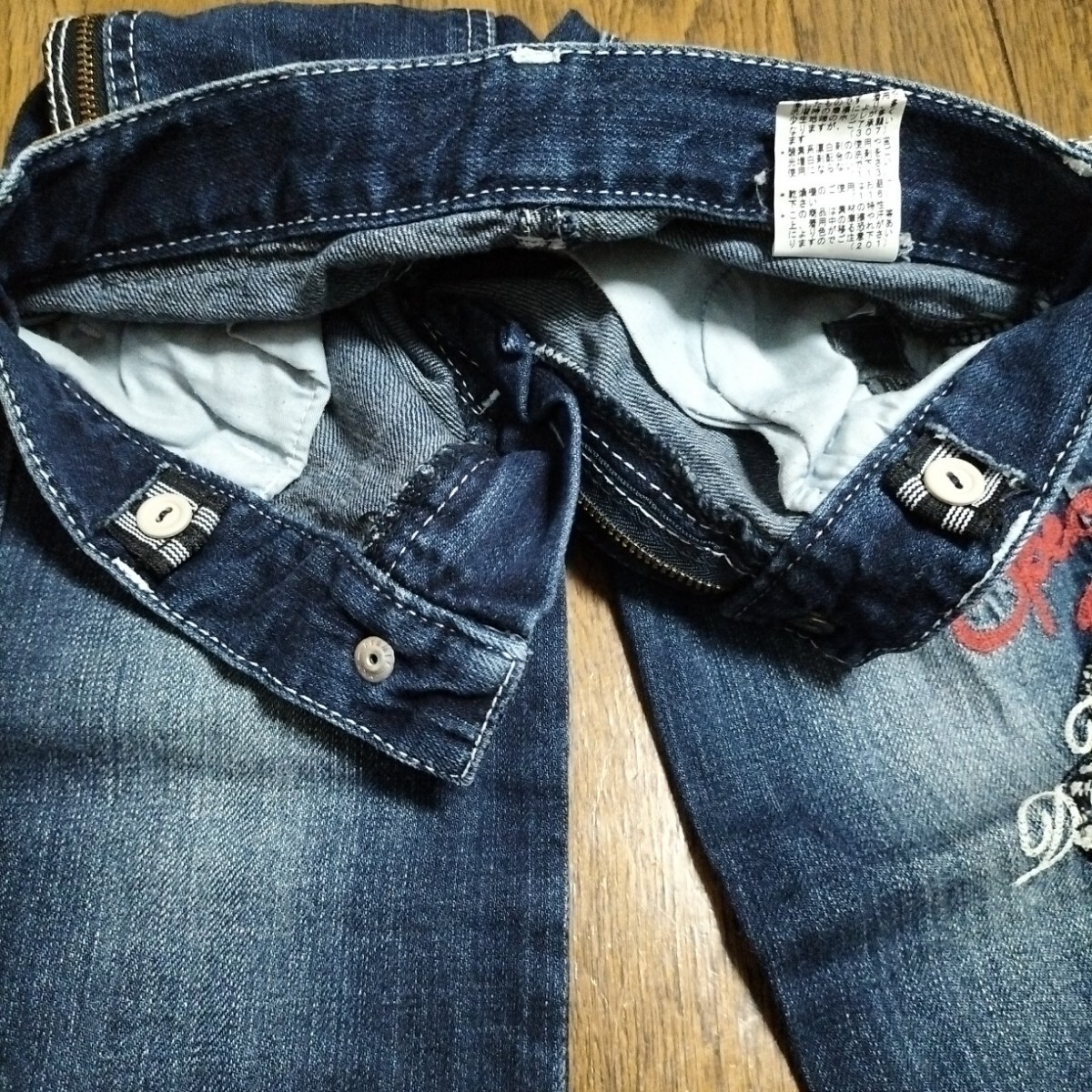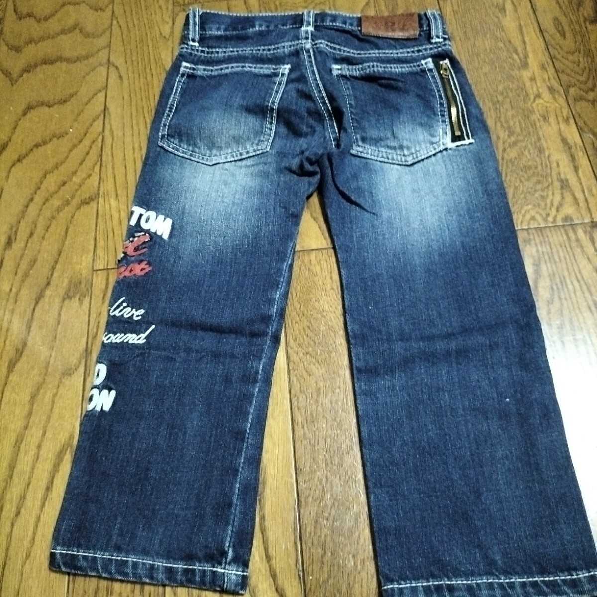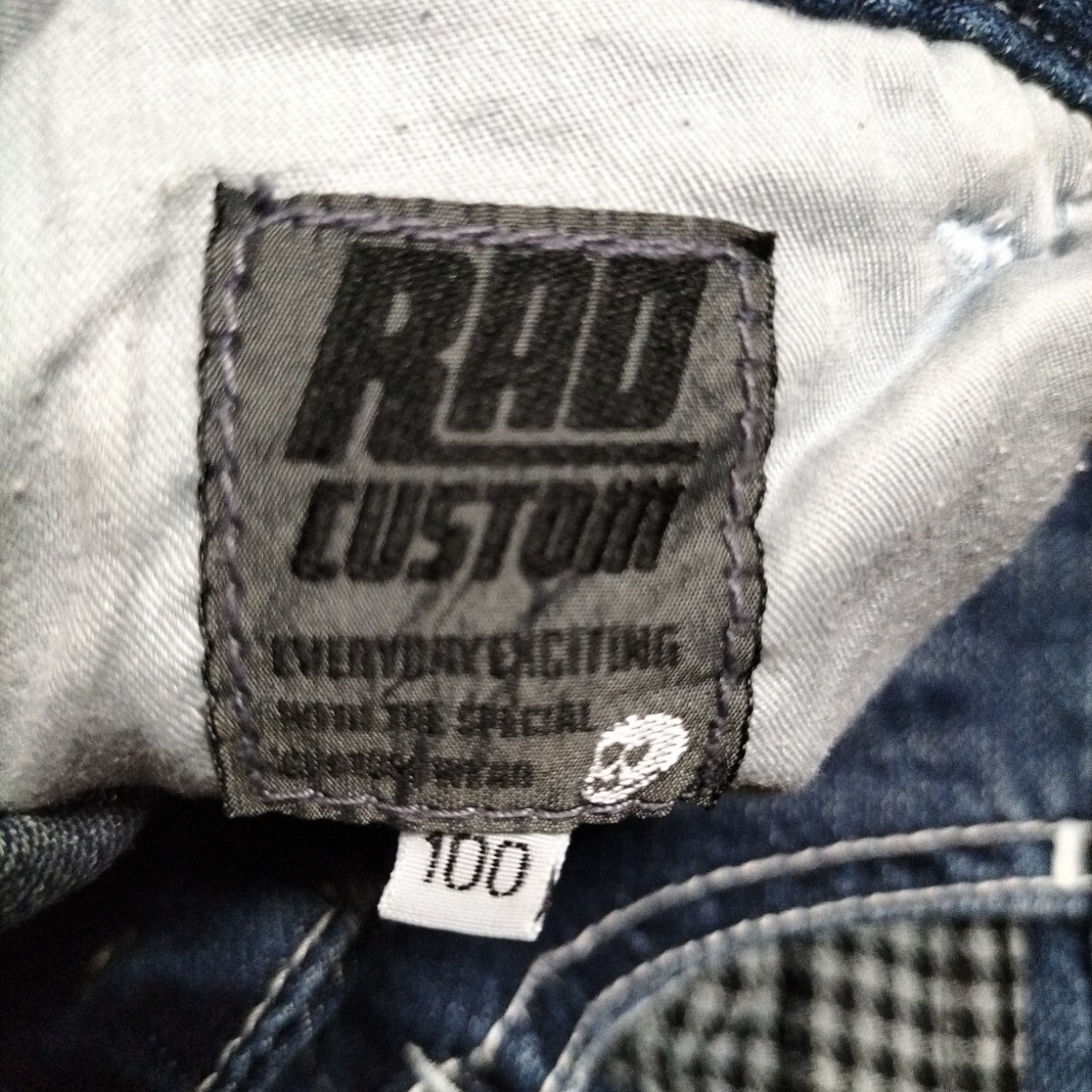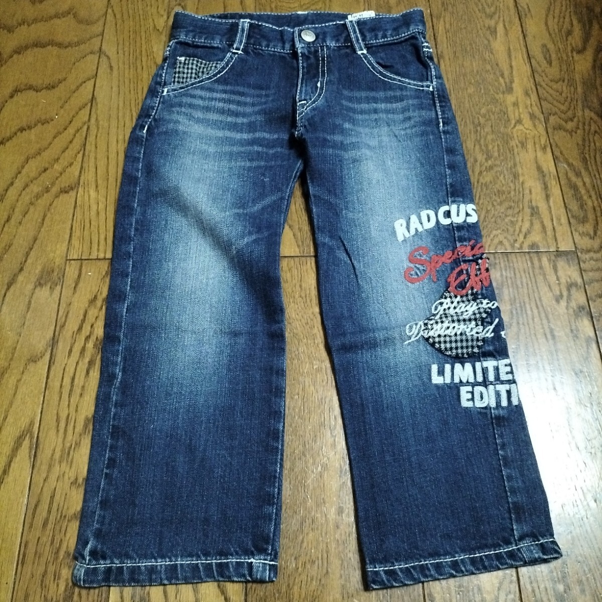 リミテッドエディションのRAD CUSTOMのダークブルー長ズボン、刺繍デザインが特徴。