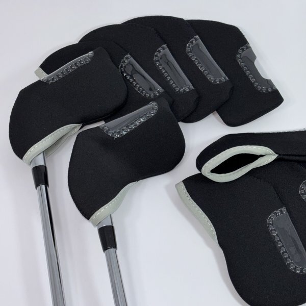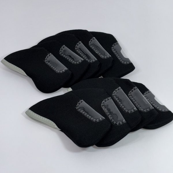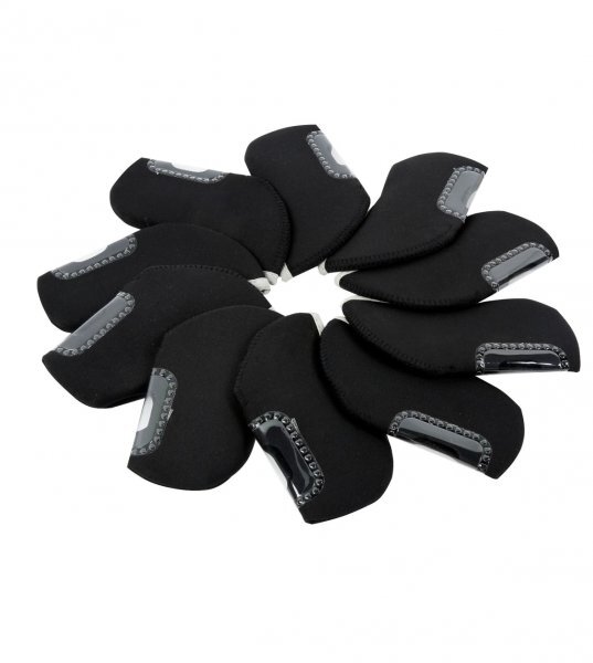 ネオプレン製のアイアン用ヘッドカバー10個セット、ブラック。窓付きで番手表示が見えます。柔らかい素材で着脱が簡単です。クッション性がありアイアンヘッドの保護になります。