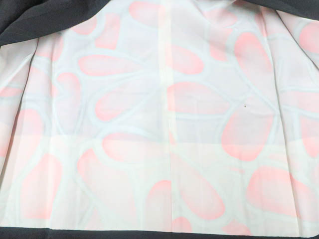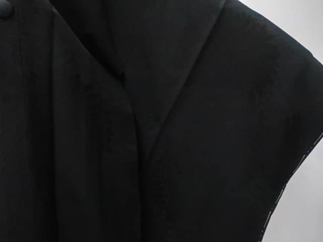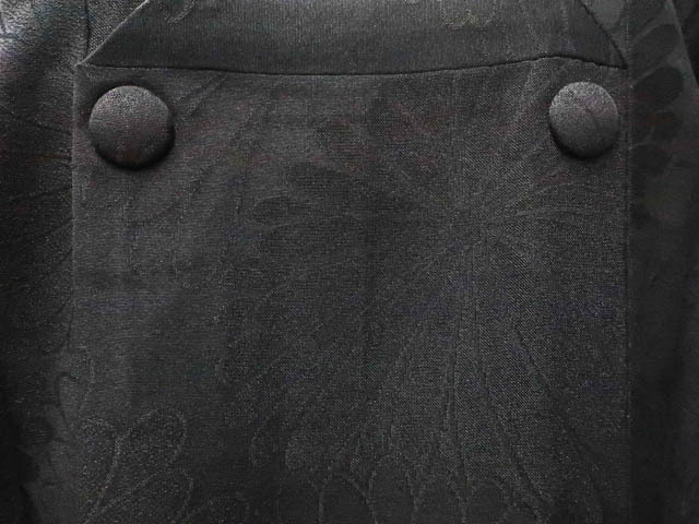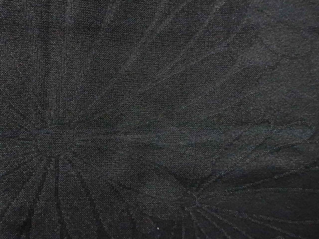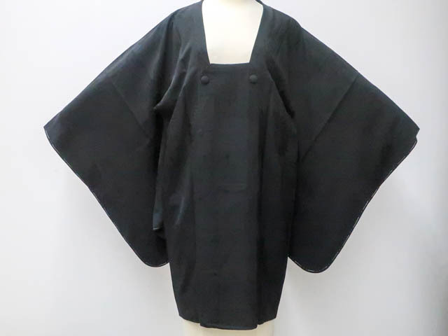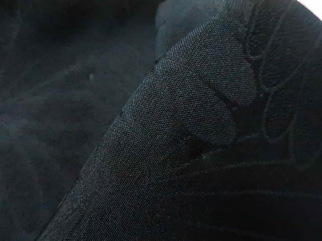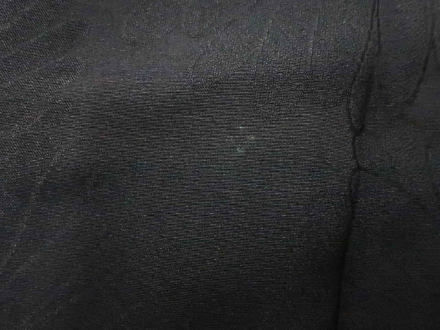 リサイクル商品のため、羽裏にスナップボタンによる汚れ、前身頃、上前衽に薄汚れがございますが着用可能なお品です。 地色は、黒色です。 1枚目の画像が近いお色かと思われます。 素材は正絹です。 |
