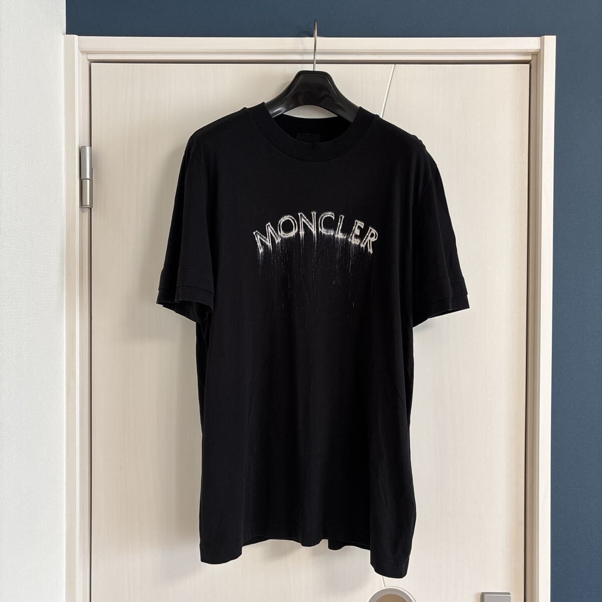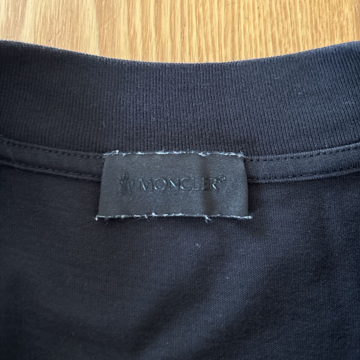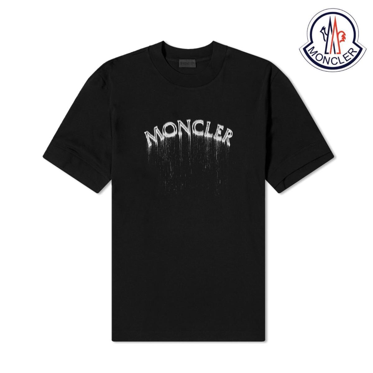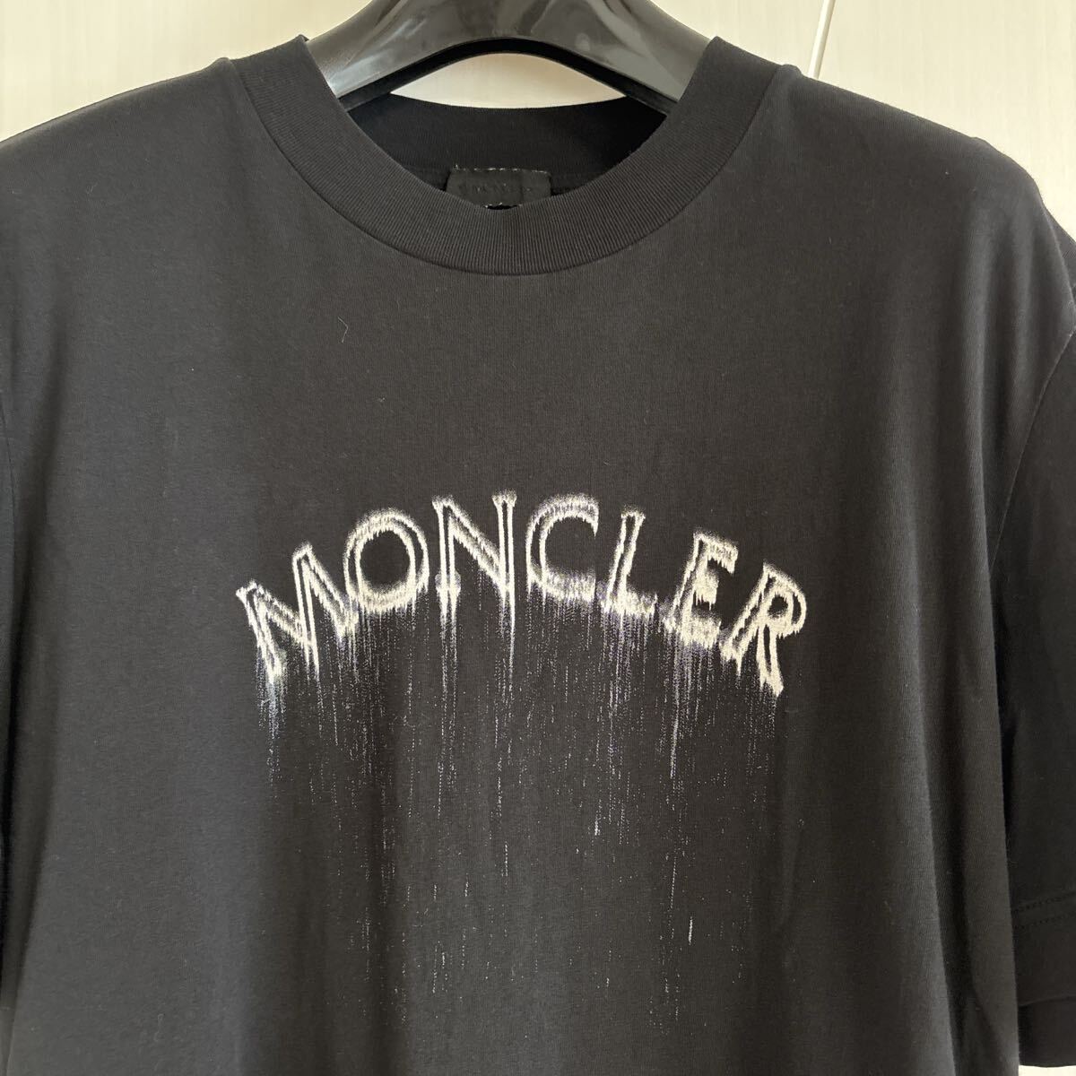 フロントにMONCLERロゴプリントのブラックTシャツ。