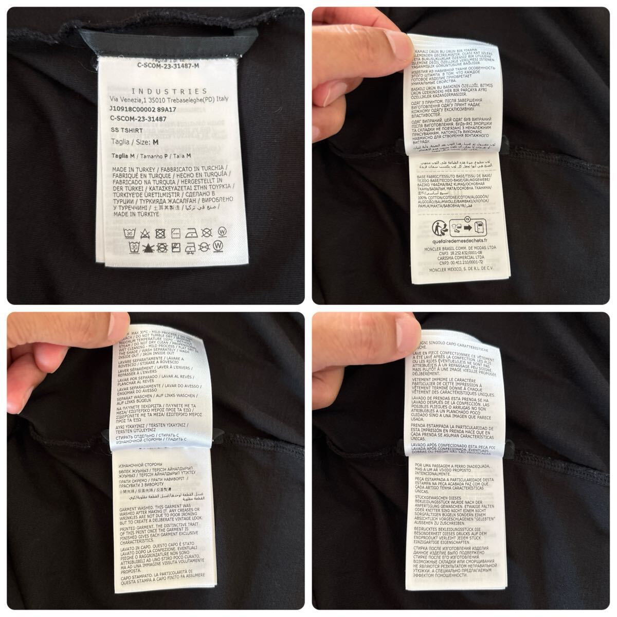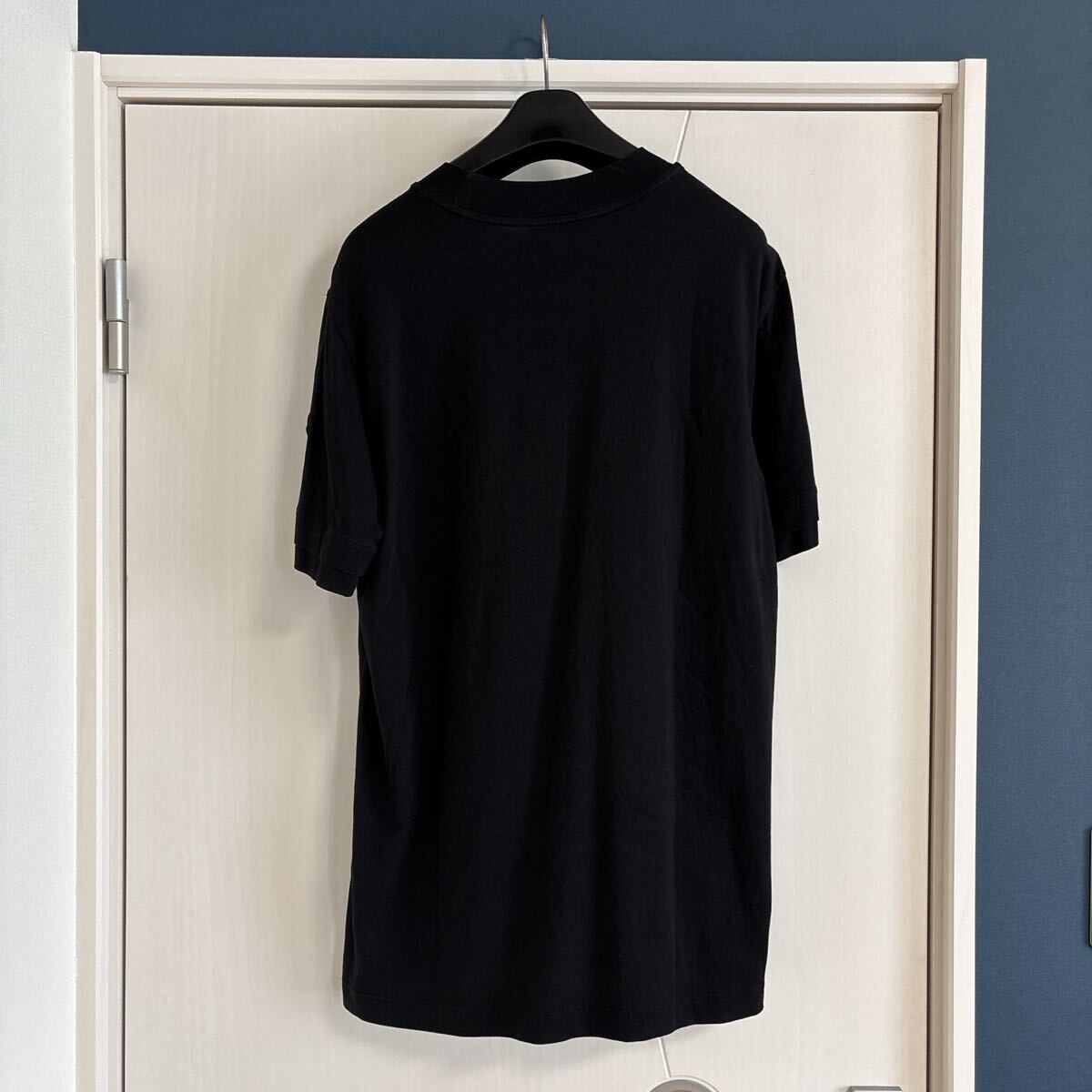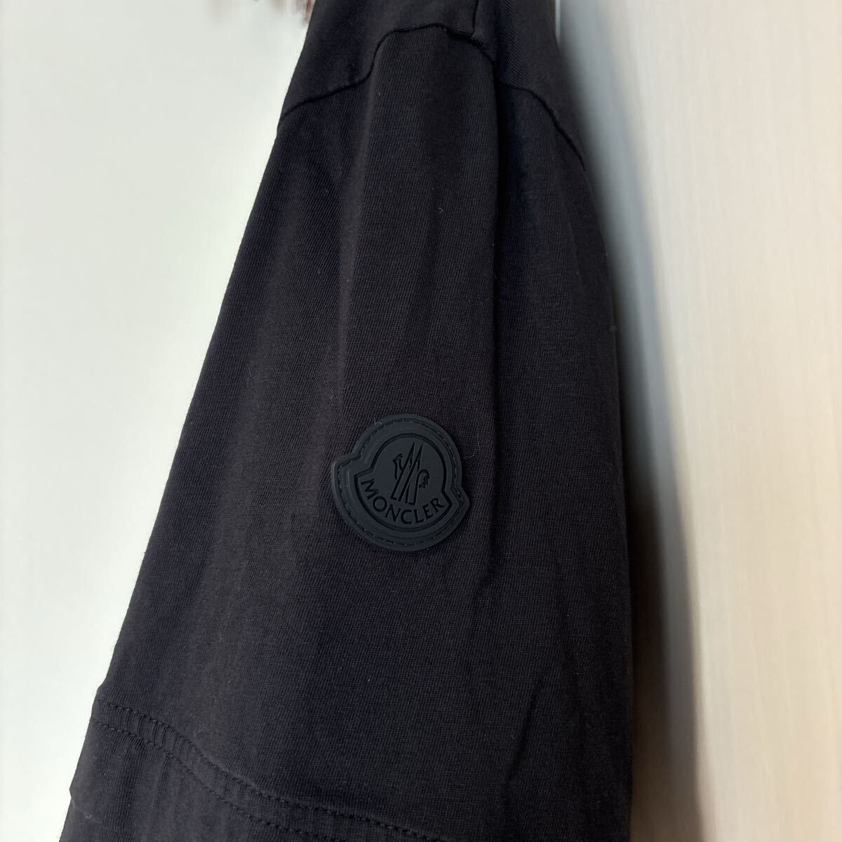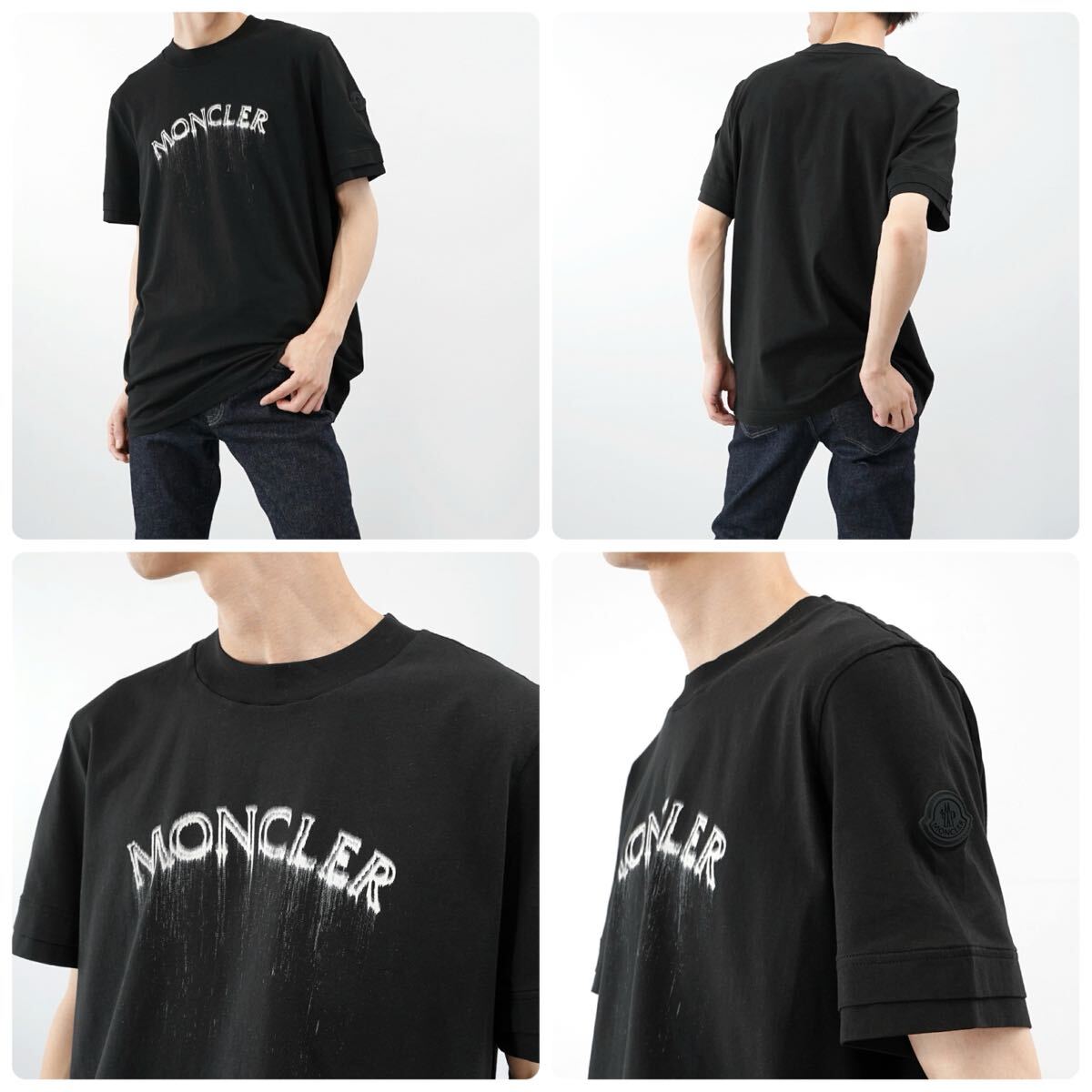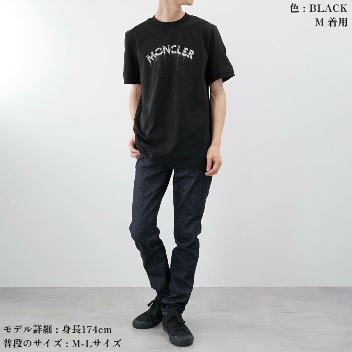 フロントにMONCLERロゴプリントのブラックTシャツ。