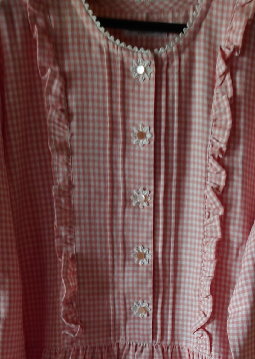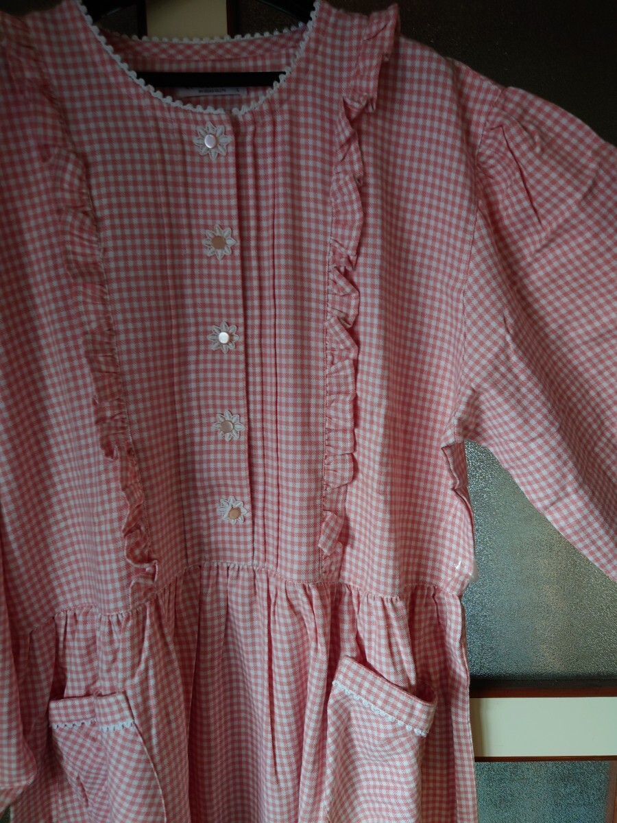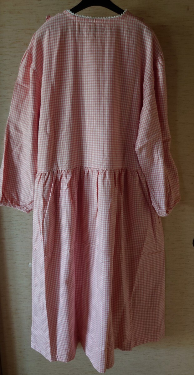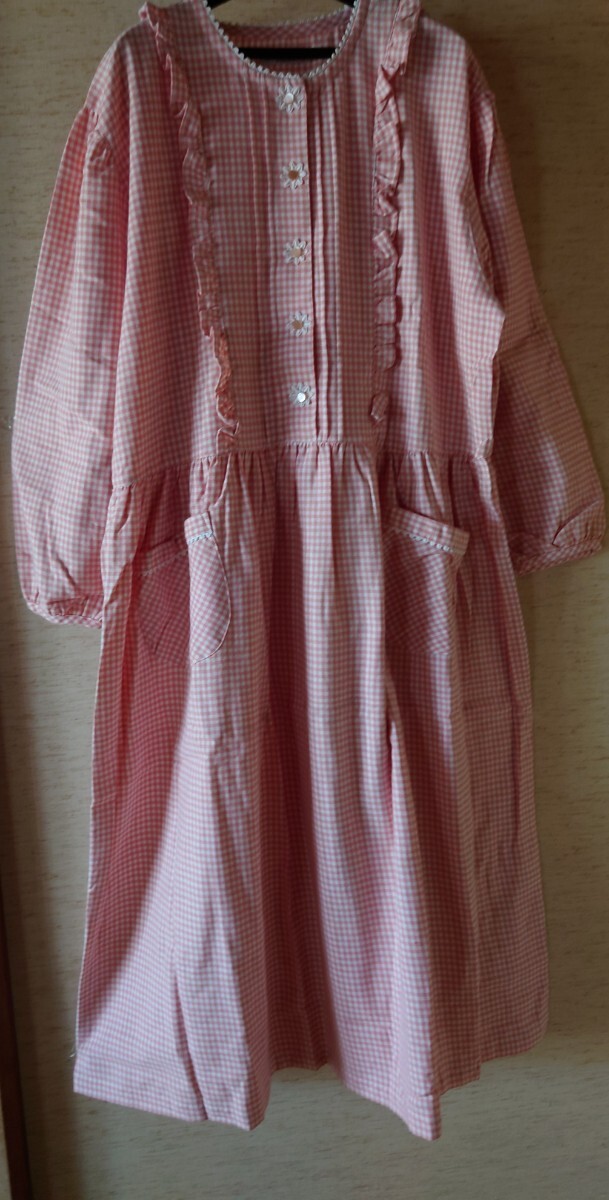 【新品未使用】フリル付き<レディースナイトウェア> <ルームウェア>< ルームワンピース> ローズピン×白チェック 綿100% L ローウエスト切替 可愛い