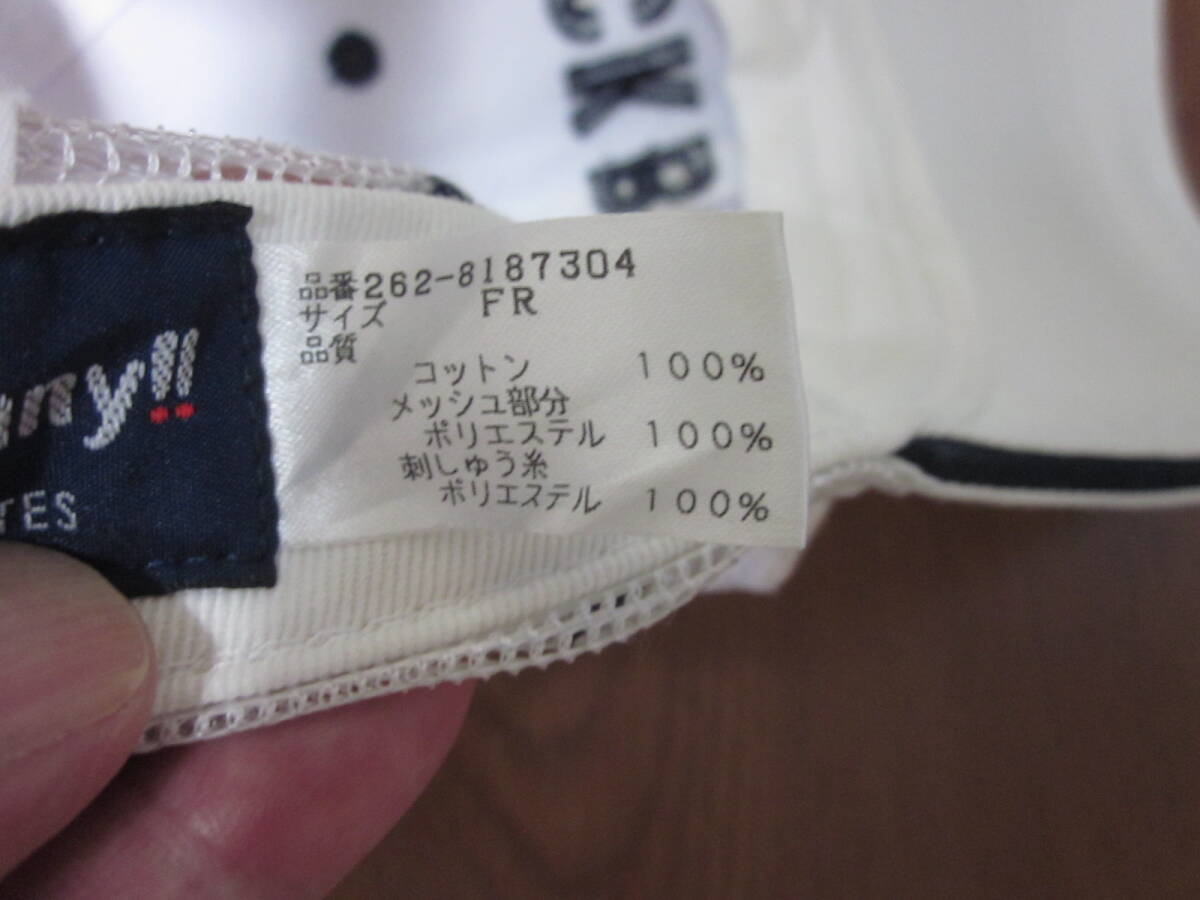 ・色は白です。フロントにブランドロゴデザインが施されています。本体の後部はメッシュ仕様です。バックにサイズ調整ベルクロ仕様のベルトが装備されています。併せてブランドロゴがデザインされています。素材は本体の前部コットン100%でメッシュ部はポリエステル100%です。多少の圧縮をかけて、ゆうパケットポスト分にて発送したします。 ・主要サイズ:つば部分の長さ:約7.5CM・深さ:約13CMぐらいです。素人測定です。多少の誤差はご容赦ください。