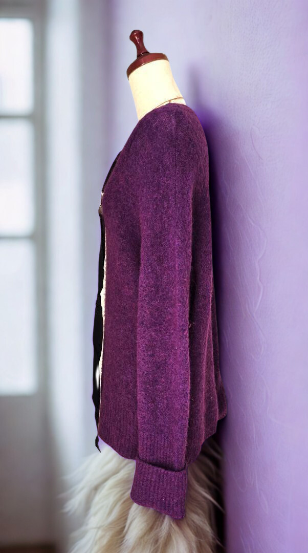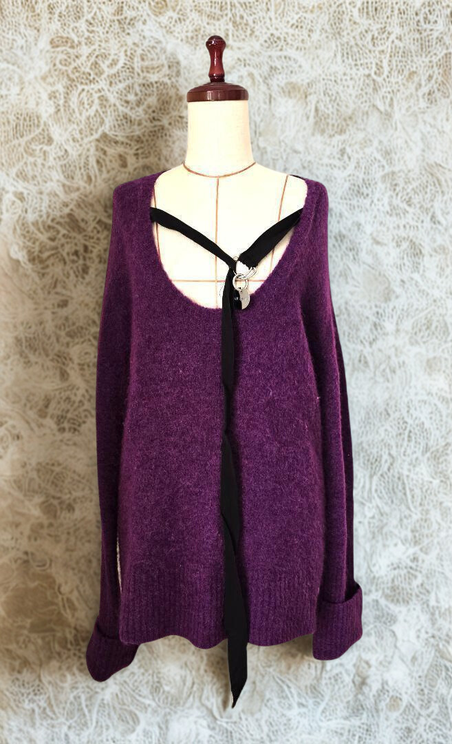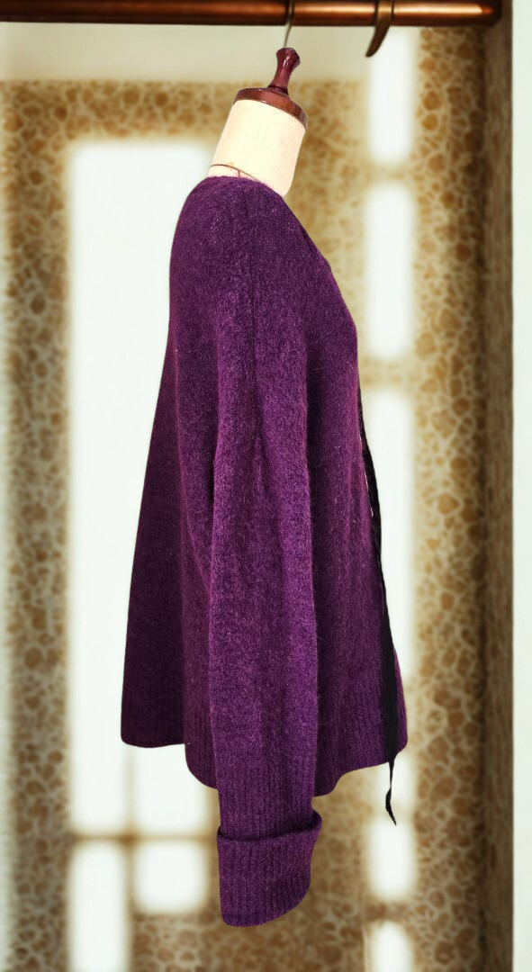 深みのあるパープルカラーが印象的で、胸元のデザインリボンがポイントになっています。ゆったりとしたシルエットで、リラックス感とおしゃれさを兼ね備えた1枚です。